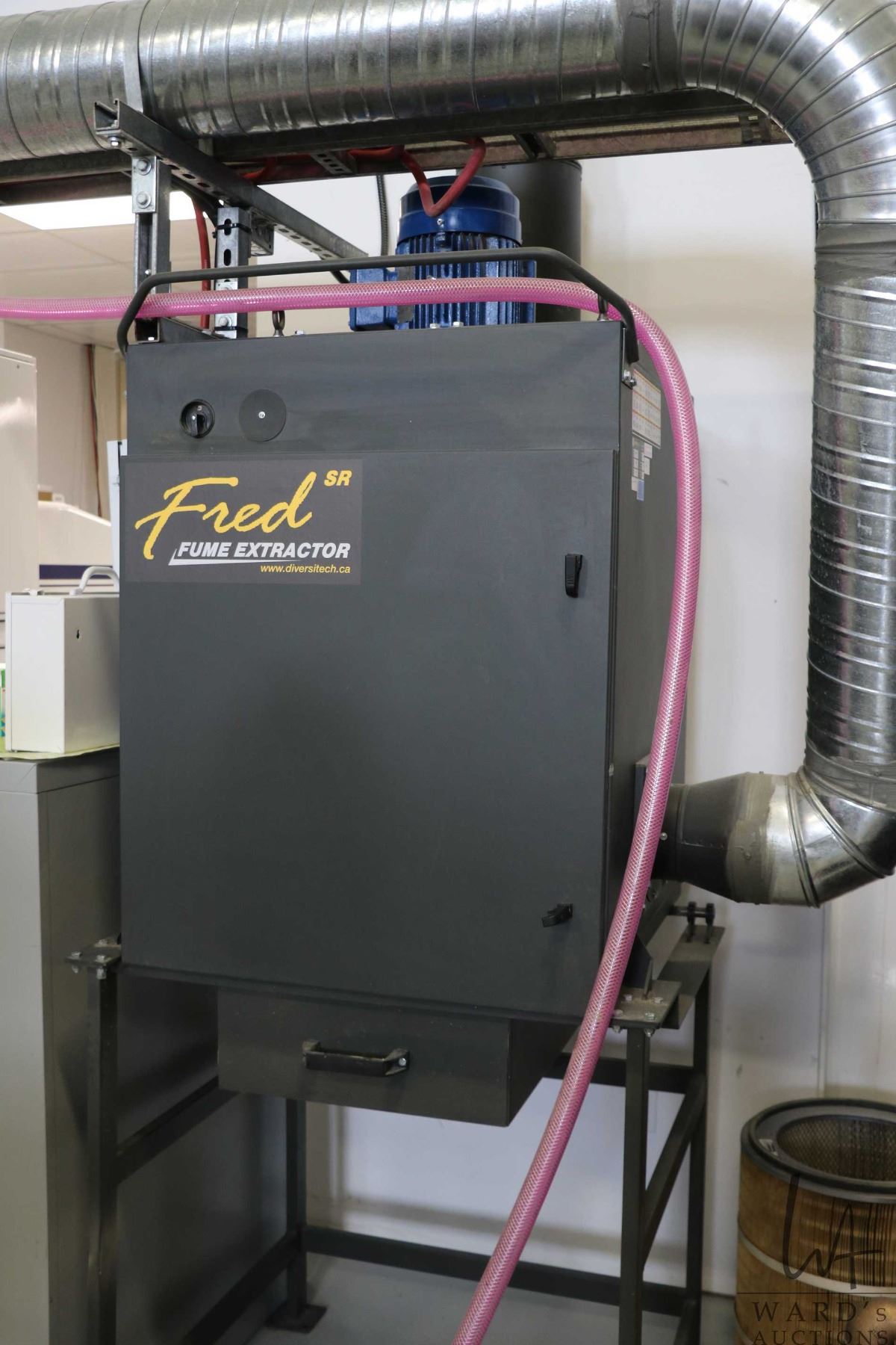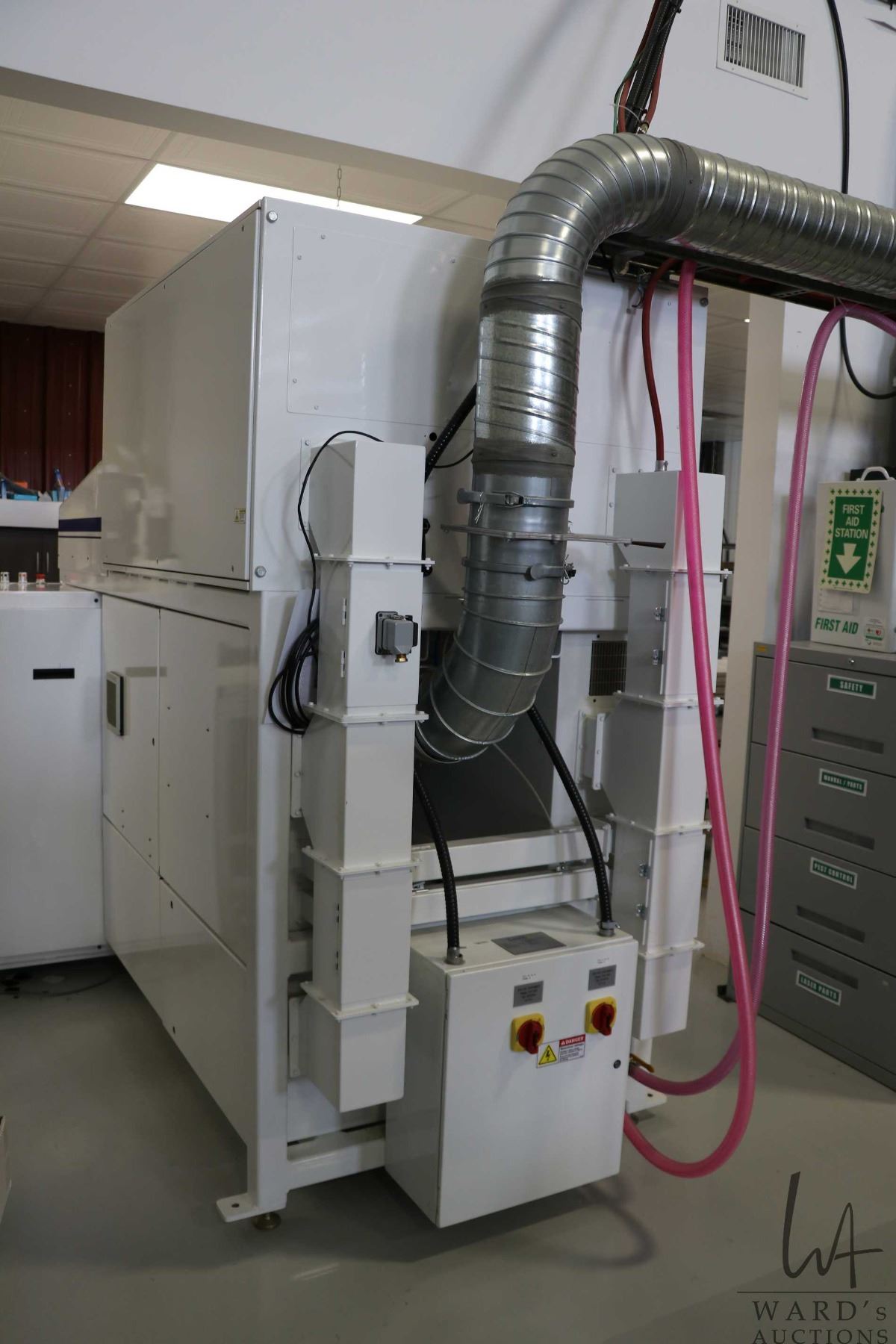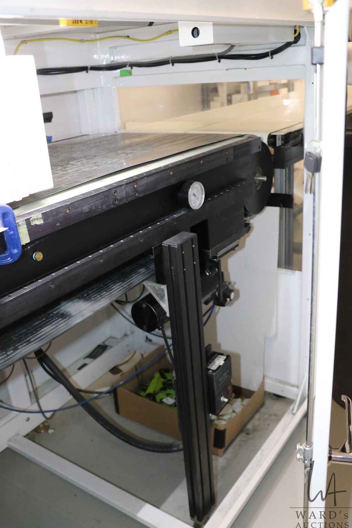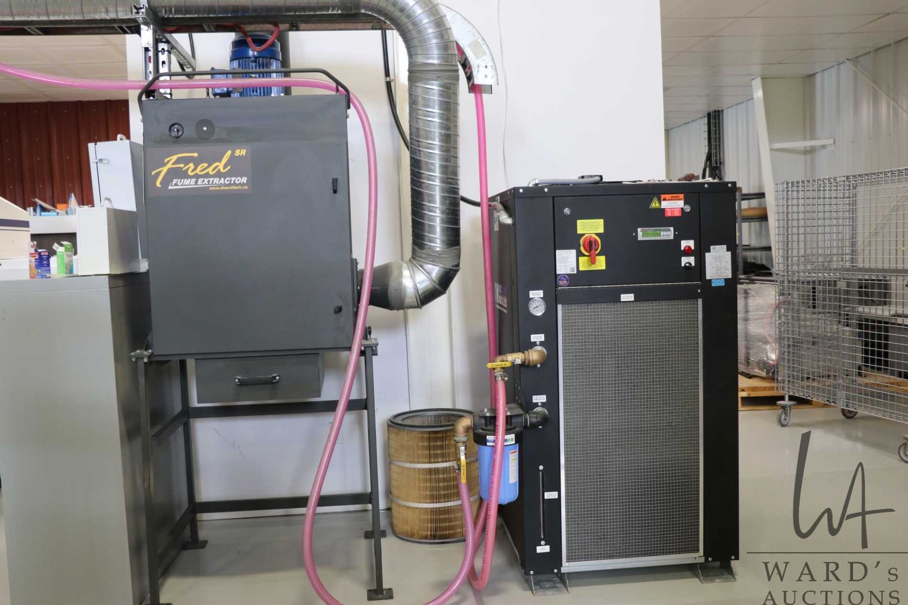 LASX 600 watt CO2 laser Lasersharp STS400-2 , SN 201709306. Fitted with two Rofin SCX 600 watt lasers, two HurryScan with VarioScan 40 dynamic focus devices, belt driven feed system with dual camera registration, Fred SR Fume Extractor and Koolant Koolers cooler. This laser can cut high end custom designed packaging and other card stock items with extreme accuracy and speed. The owner of Inkubate Packaging is open to being hired by the successful buyer to train on the operation and maintenance of this laser prior to removal. LasX has confirmed that they can be contracted to offer advice regarding preparation for moving and technical help after setup for things like alignment and calibration etc. Physical removal of the machine must be done by a licensed, experienced and insured mover like Wingenback (wingenback.com) See video on website shot on March 30, 2026. -- This setup can be seen in operation on preview day and the owner is available for hire to train after the auction, prior to removal.