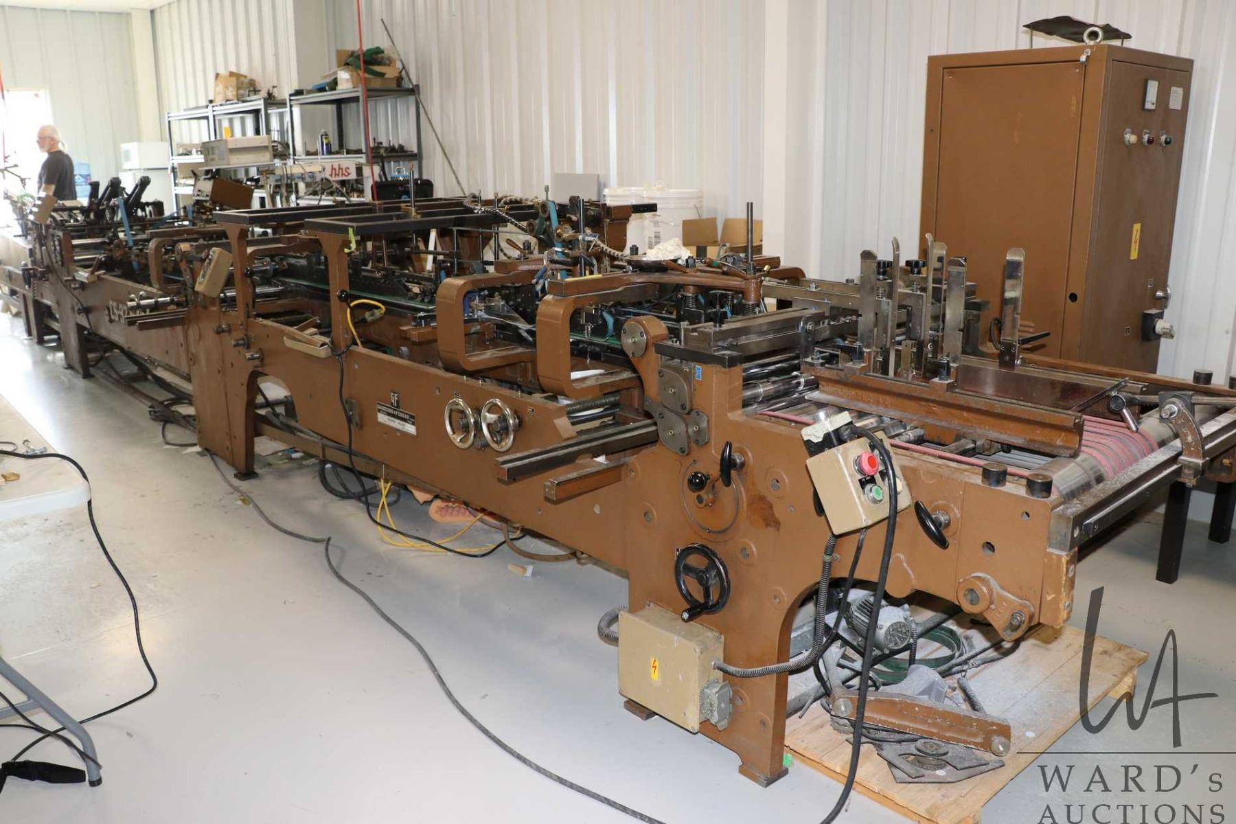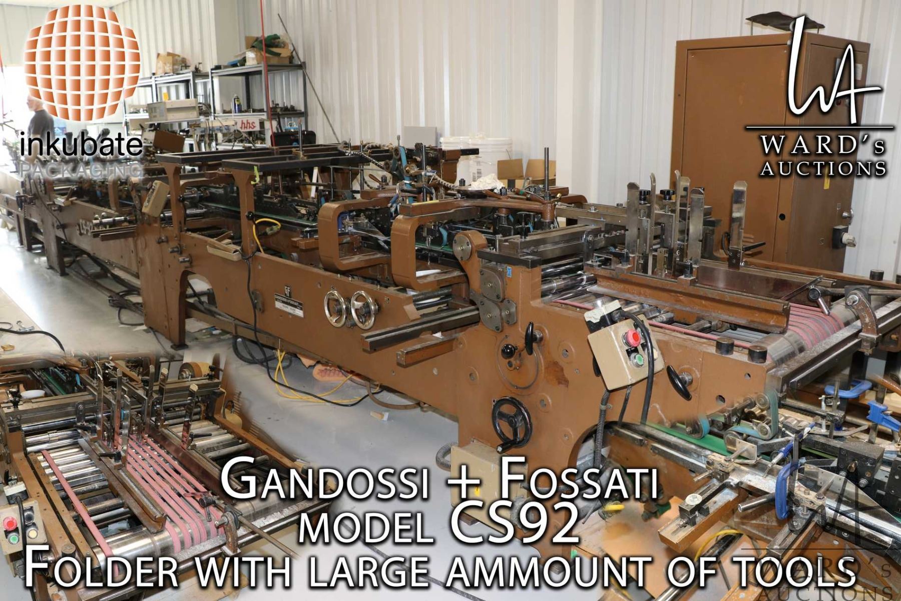 Gandossi & Fossati Model CS92 Folder Gluer serial number C301, approximately 411" long and includes a huge amount of tooling (tens of thousands of dollars worth) for configuring to different jobs. Used for folding and gluing cartons, boxes, folders etc. Does not include the hss C-1100 Glue System that will be sold as lot 109. - See video on website shot on March 30, 2026. This setup can be seen in operation on preview day. - Physical removal of the machine must be done by a licensed, experienced and insured mover like Wingenback (wingenback.com)