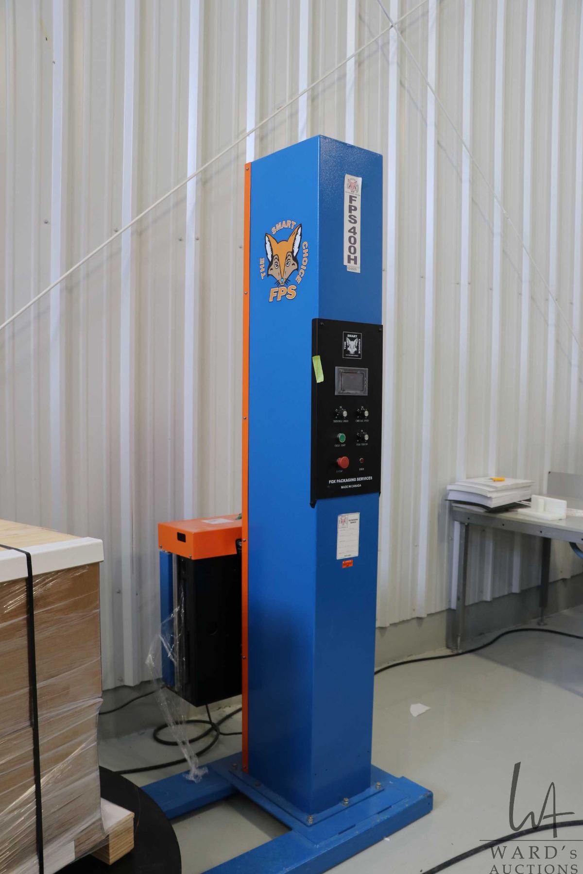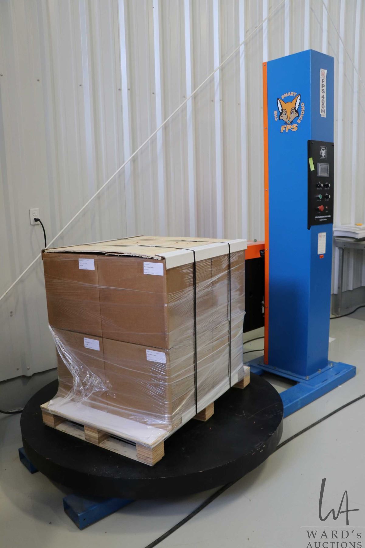 Fox Packaging Services pallet stretch wrap machine, model FPS-400H. Serial Number 400H-012816-047. 115V. - See video on website shot on March 30, 2026. This setup can be seen in operation on preview day.