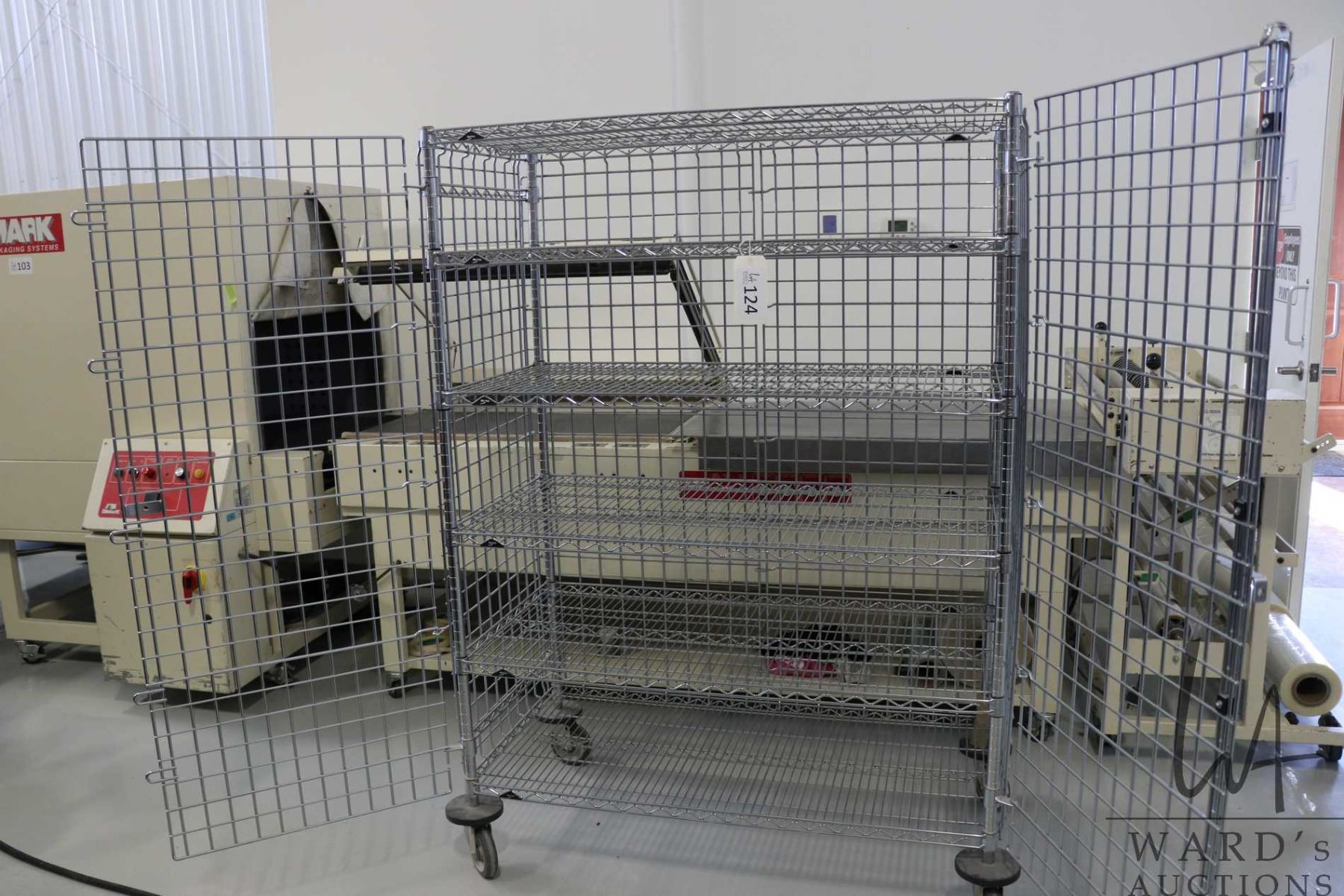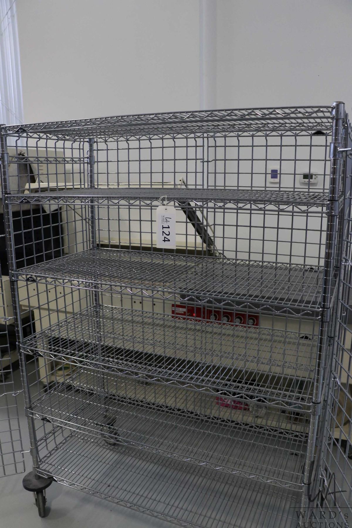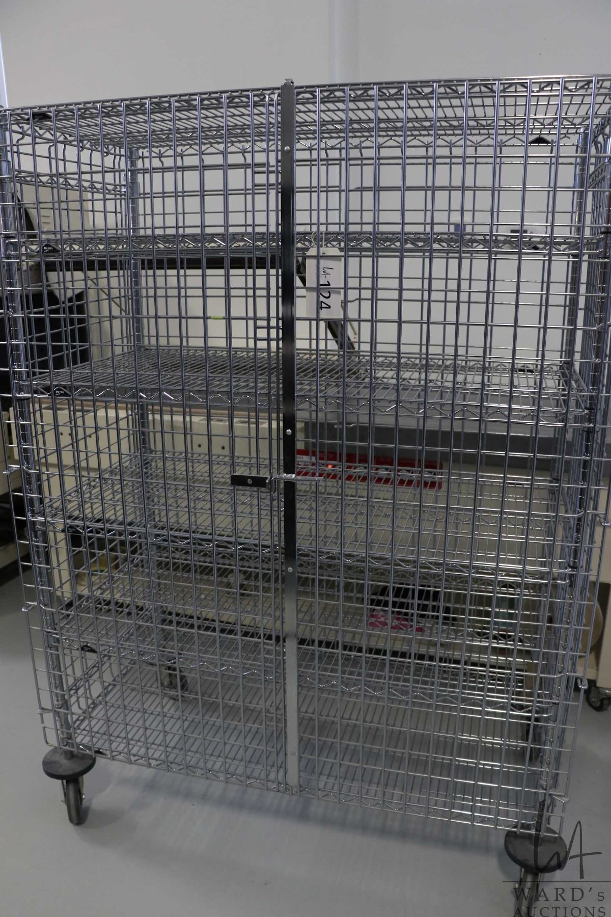 Lot 124 Heavy duty two door, lockable cabinet on castors, four shelves, 68"h x 29"w x 25"d.