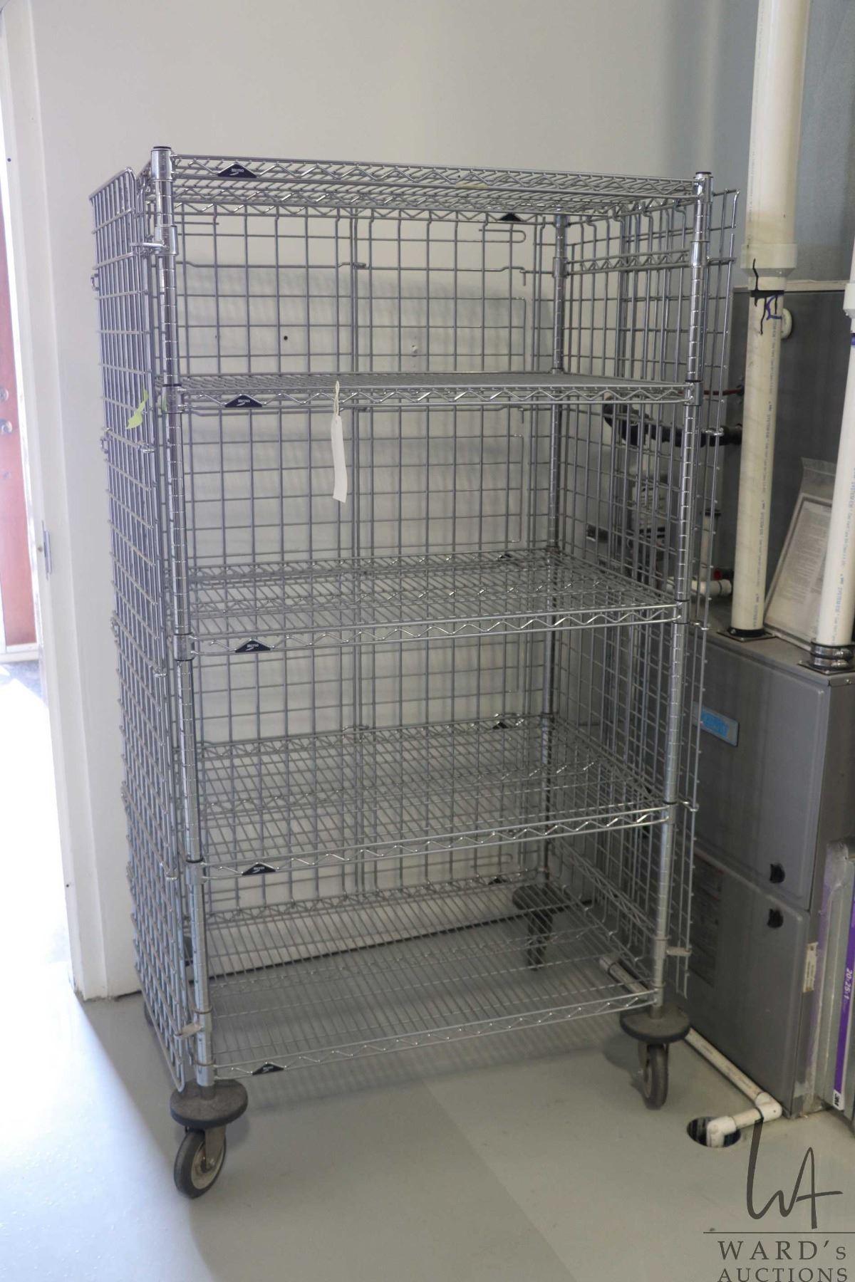 Heavy duty two door, lockable cabinet on castors, three shelves, 68"h x 38"w x 24"d.