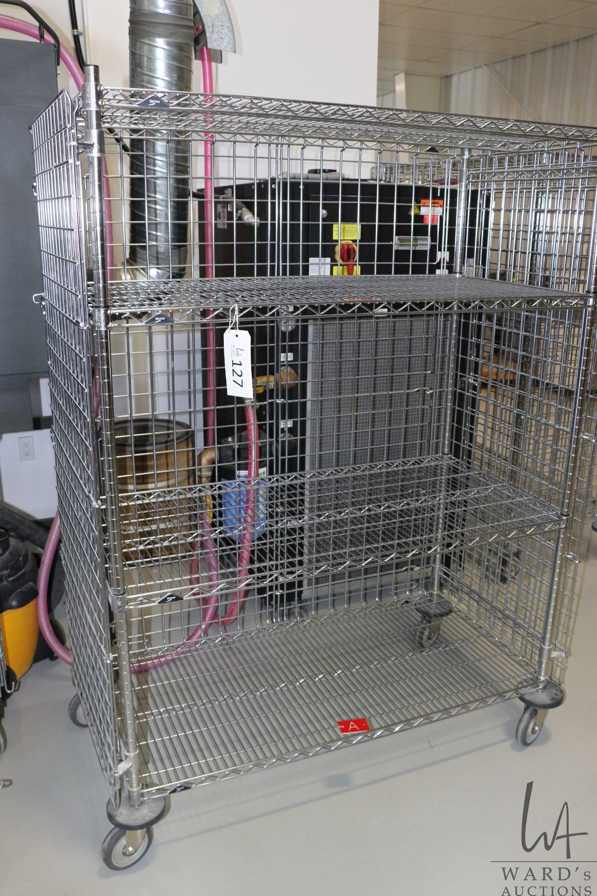 Lot 127 Heavy duty two door, lockable cabinet on castors, two shelves, 68"h x 49"w x 25"d.