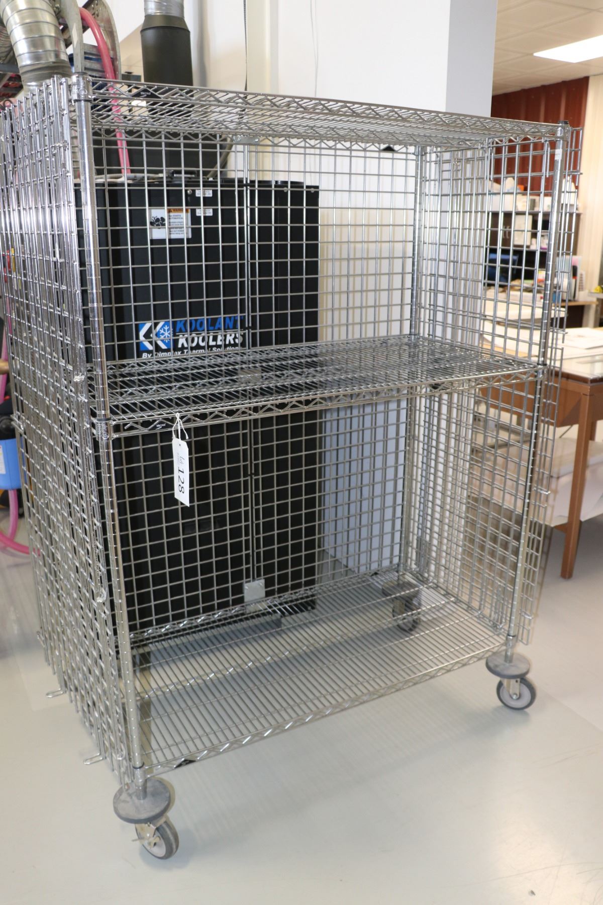 Lot 129 Heavy duty two door, lockable cabinet on castors, one shelf, 68"h x 52"w x 25"d.
