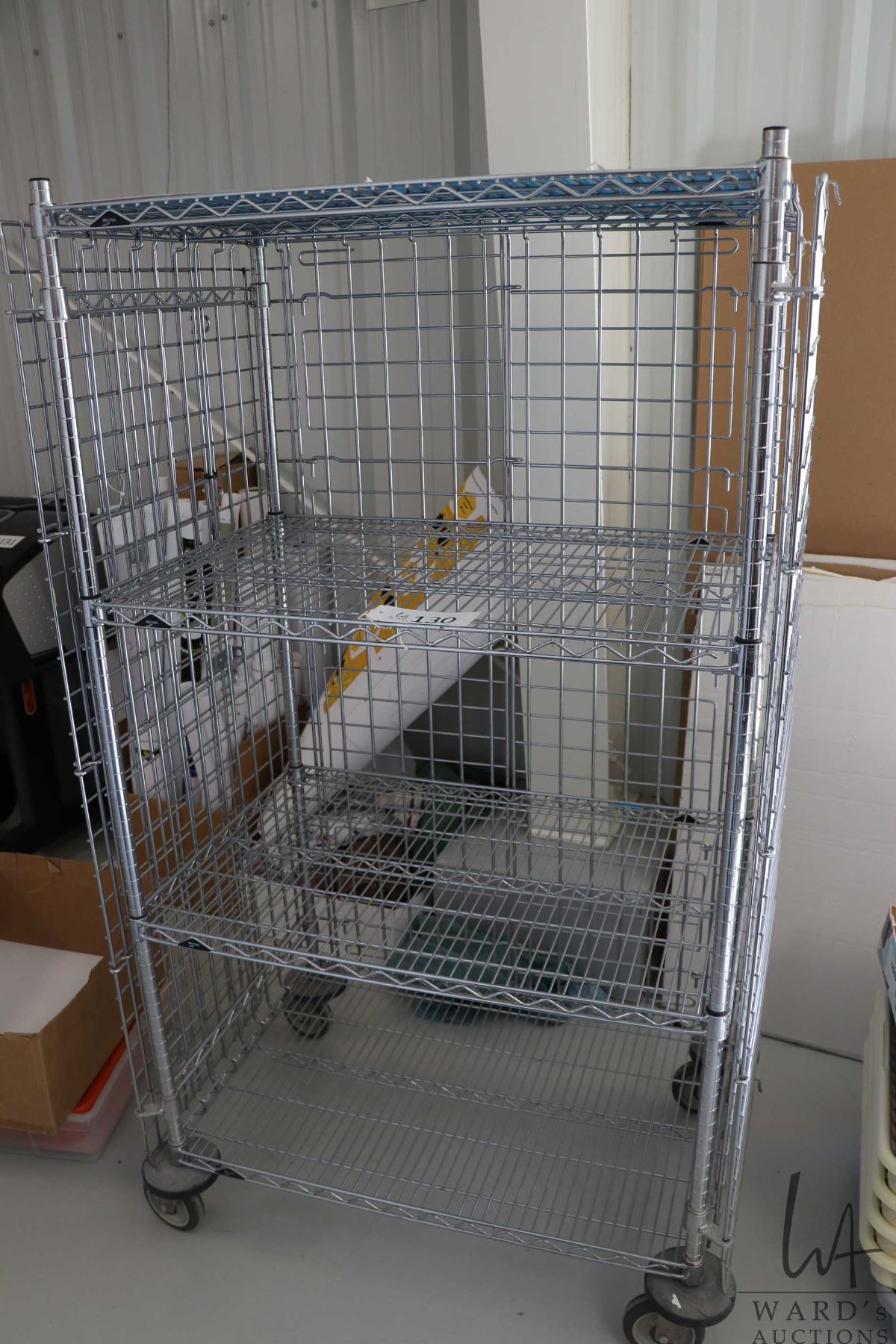 Lot 130 Heavy duty two door, lockable cabinet on castors, two shelves, 68"h x 38"w x 25"d.
