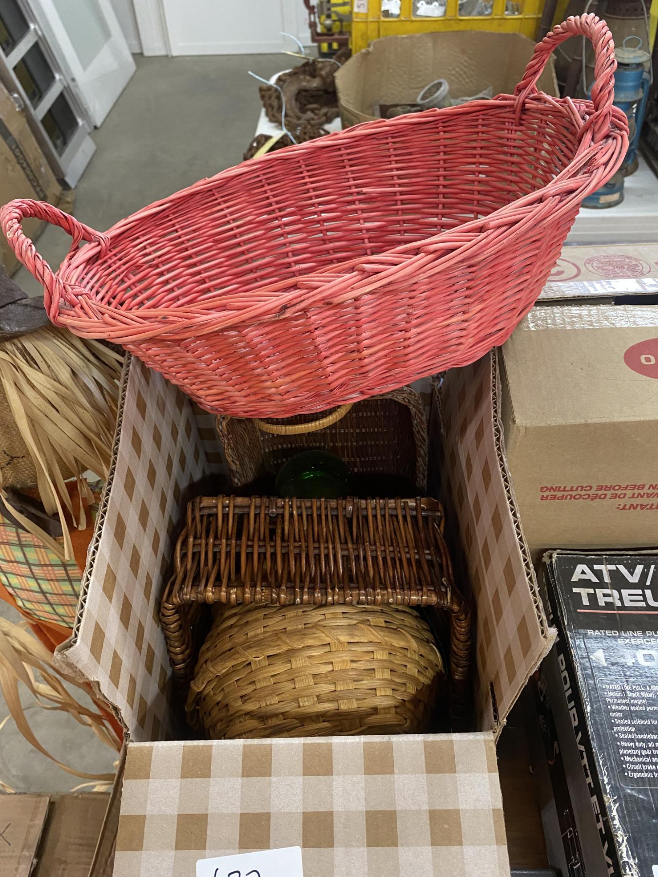 Lot 620 BOX LOT OF BASKETS AND A GREEN CANDY JAR WITH COVER