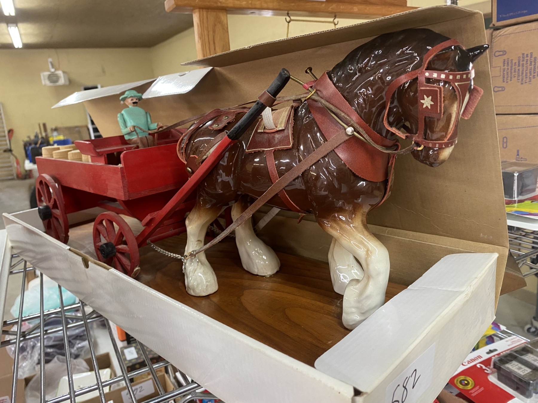 Lot 582 VERY NICE PORCELAIN HORSE DECORATION WITH WOODEN BUGGY