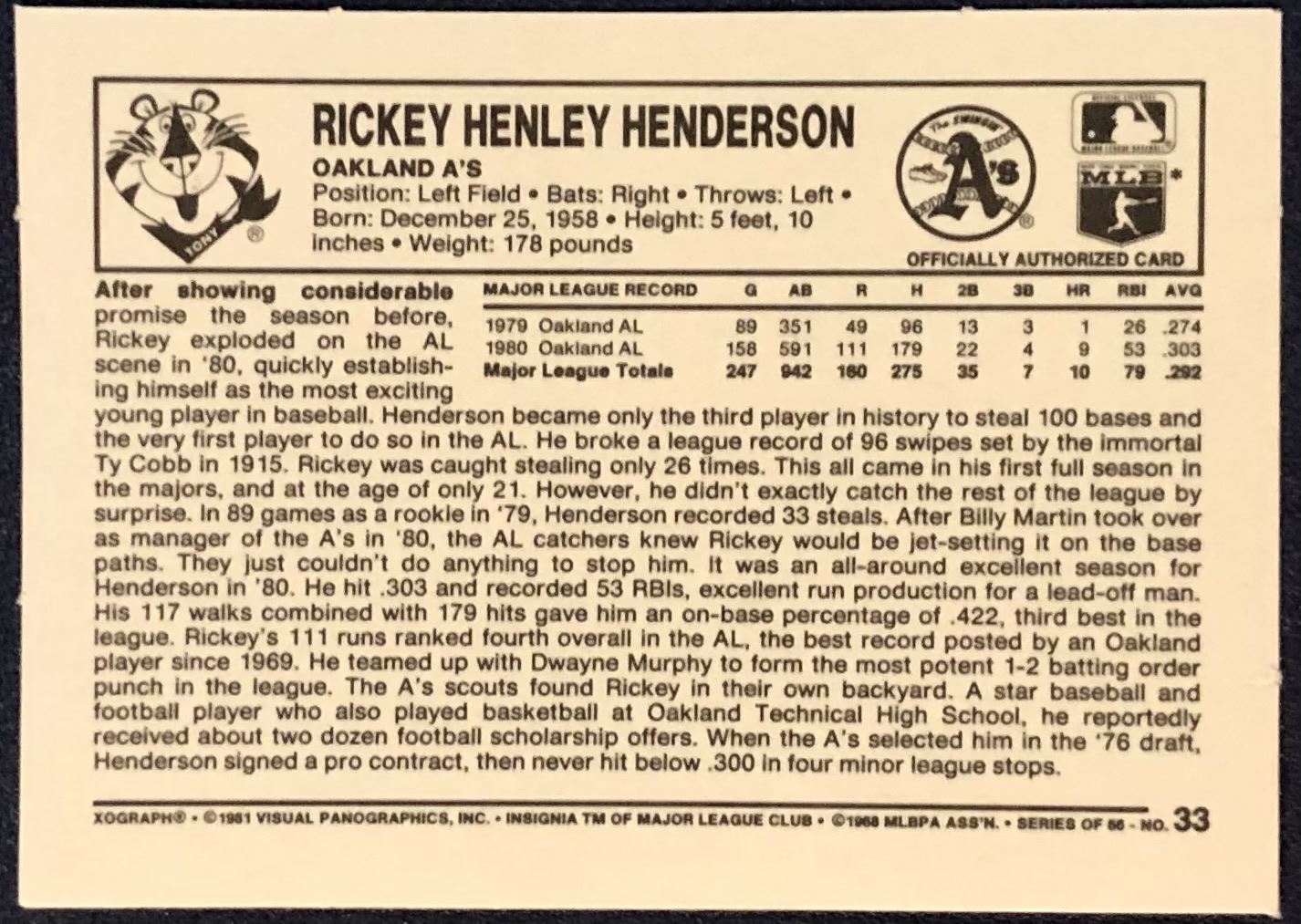 Lot 16 1981 KELLOGGS 3-D BASEBALL RICKEY HENDERSON (HOF)