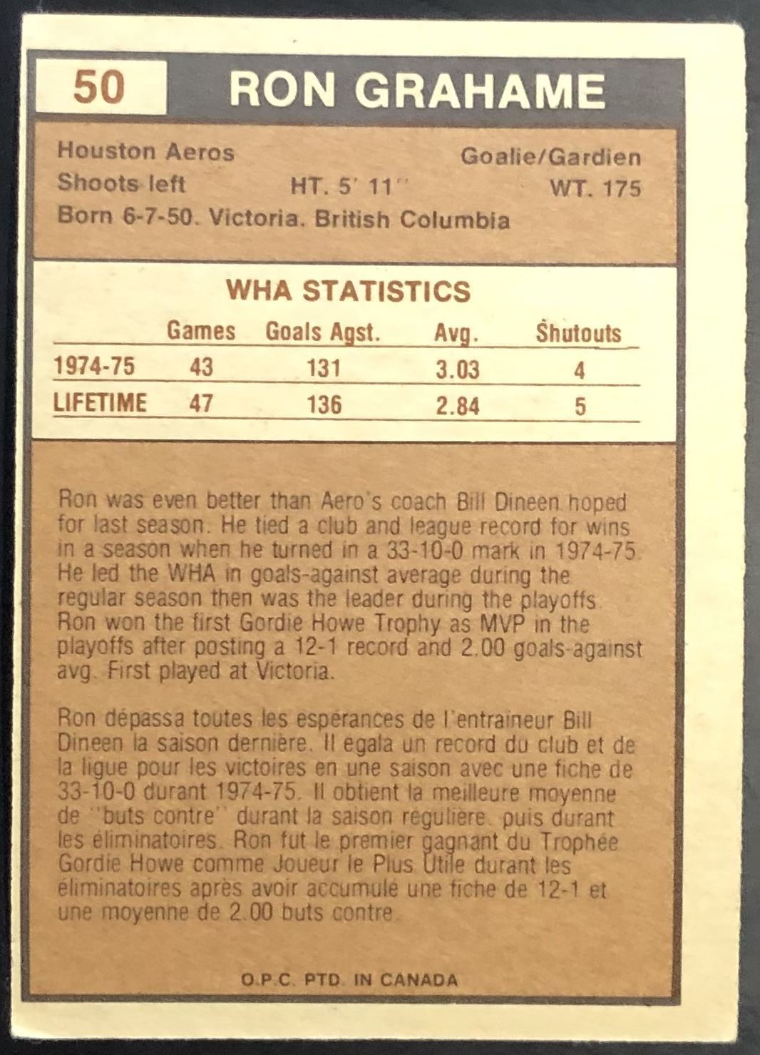 Lot 32 1975-76 O-PEE-CHEE W.H.A. RON GRAHAME ROOKIE CARD