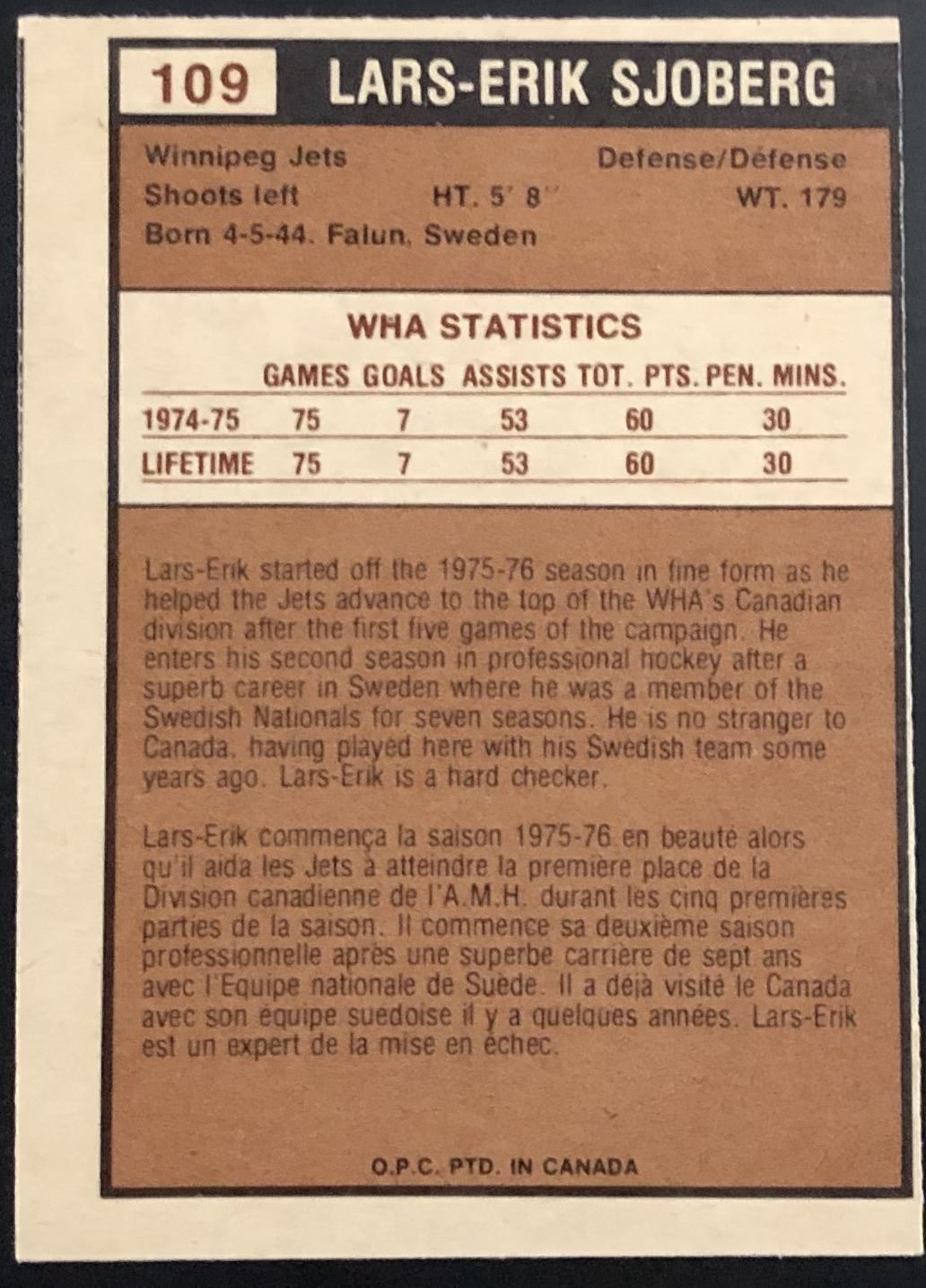 Lot 33 1975-76 O-PEE-CHEE WHA LARS-ERIK SJOBERG ROOKIE CARD