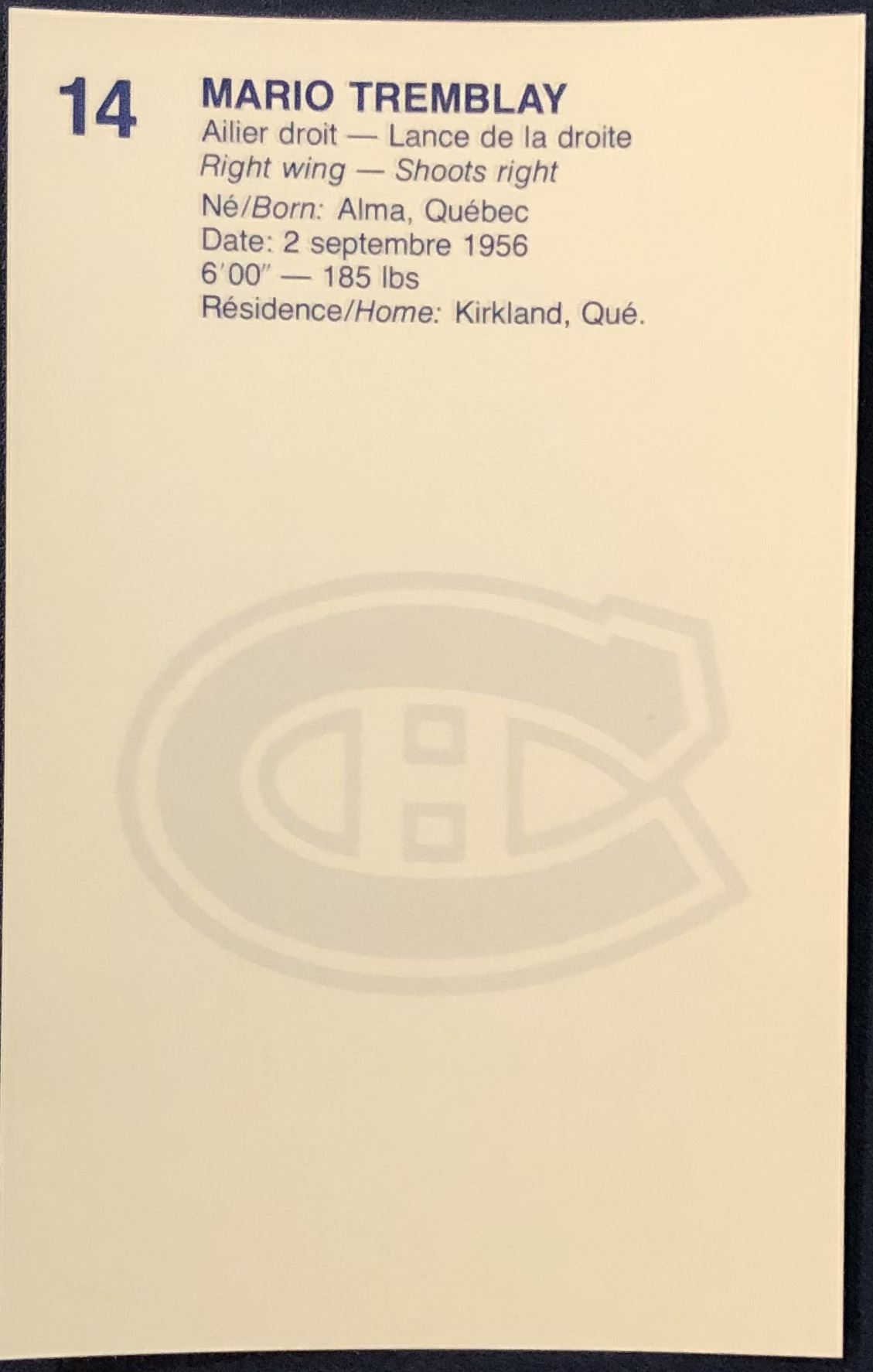 1981-82 MONTREAL CANADIENS POST CARD - MARIO TREMBLAY
