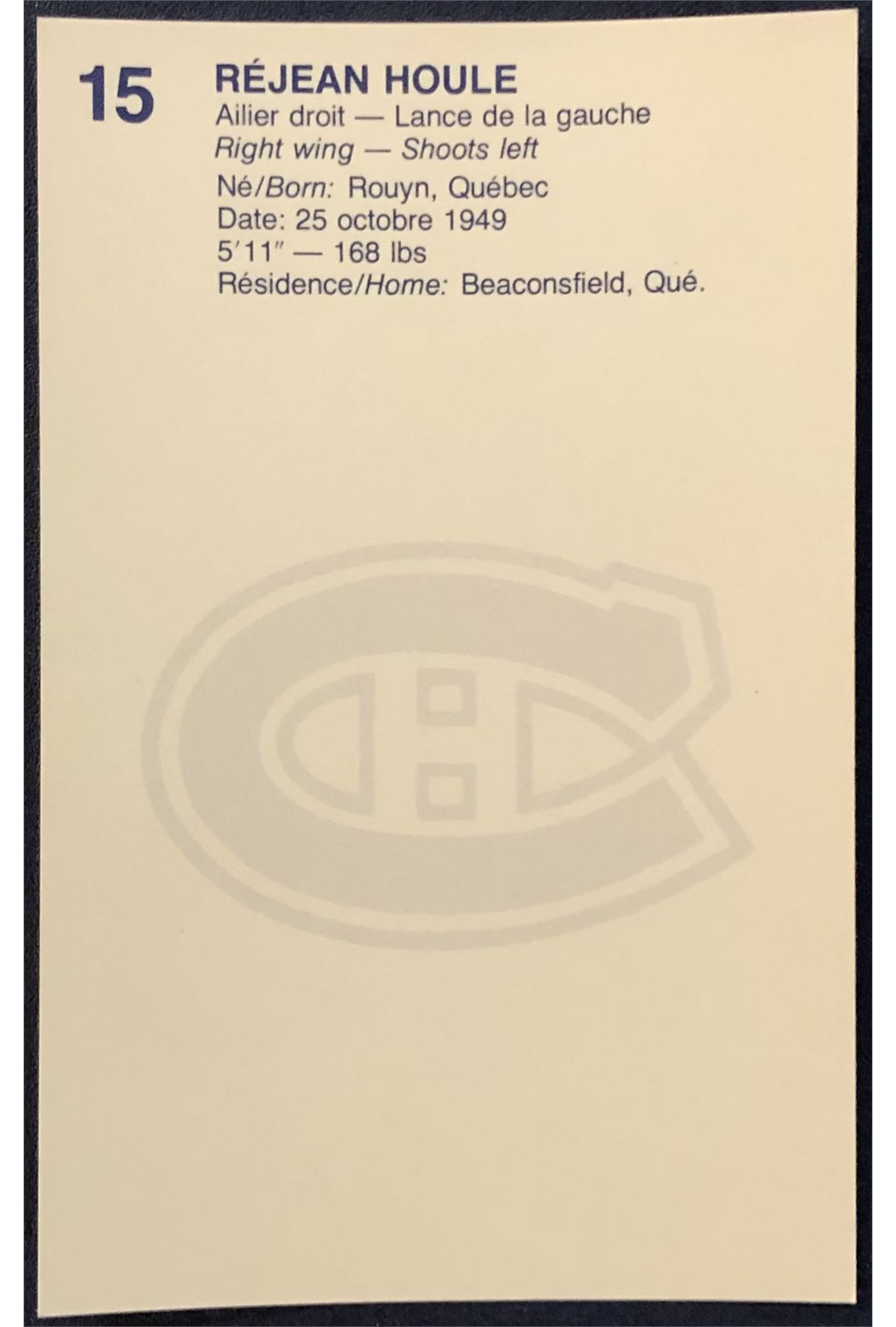 Lot 39 1981-82 MONTREAL CANADIENS POST CARD - REJEAN HOULE