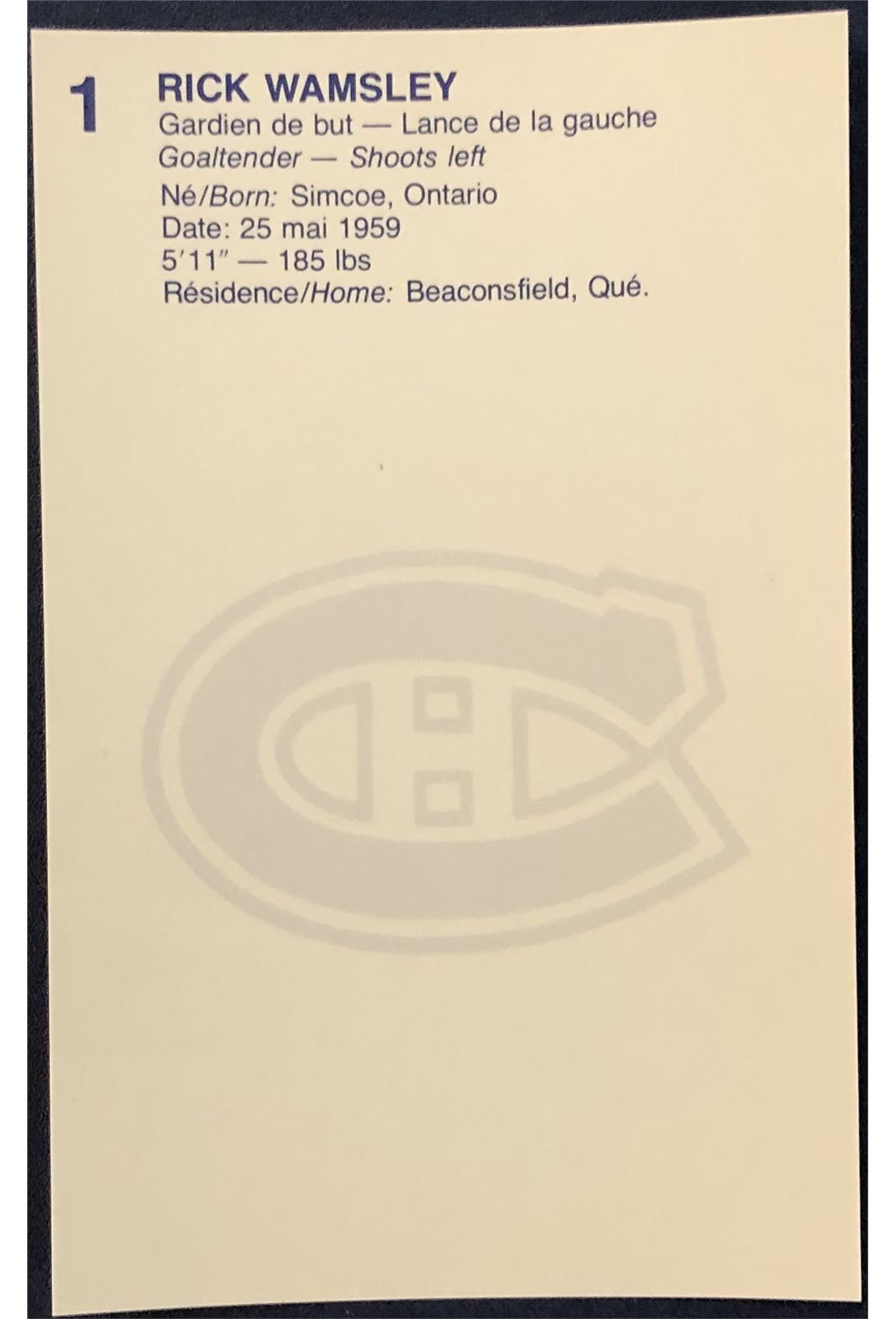 Lot 40 1981-82 MONTREAL CANADIENS POST CARD - RICK WAMSLEY