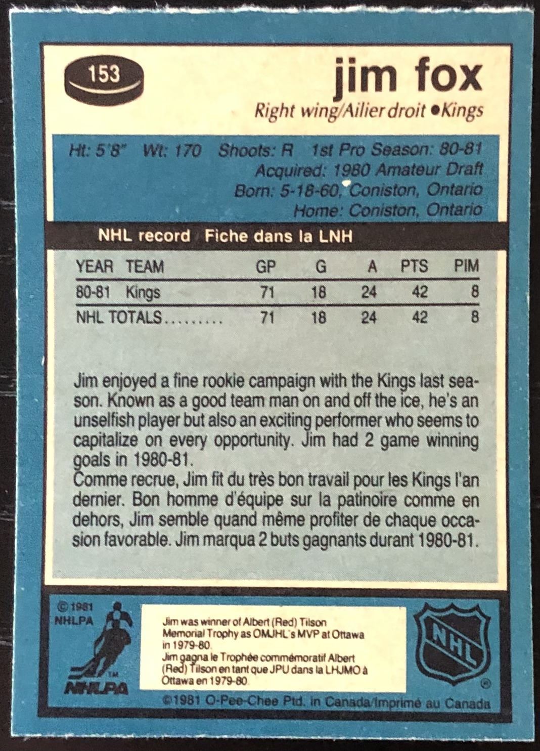 Lot 51 1981-82 O-PEE-CHEE JIM FOX ROOKIE CARD