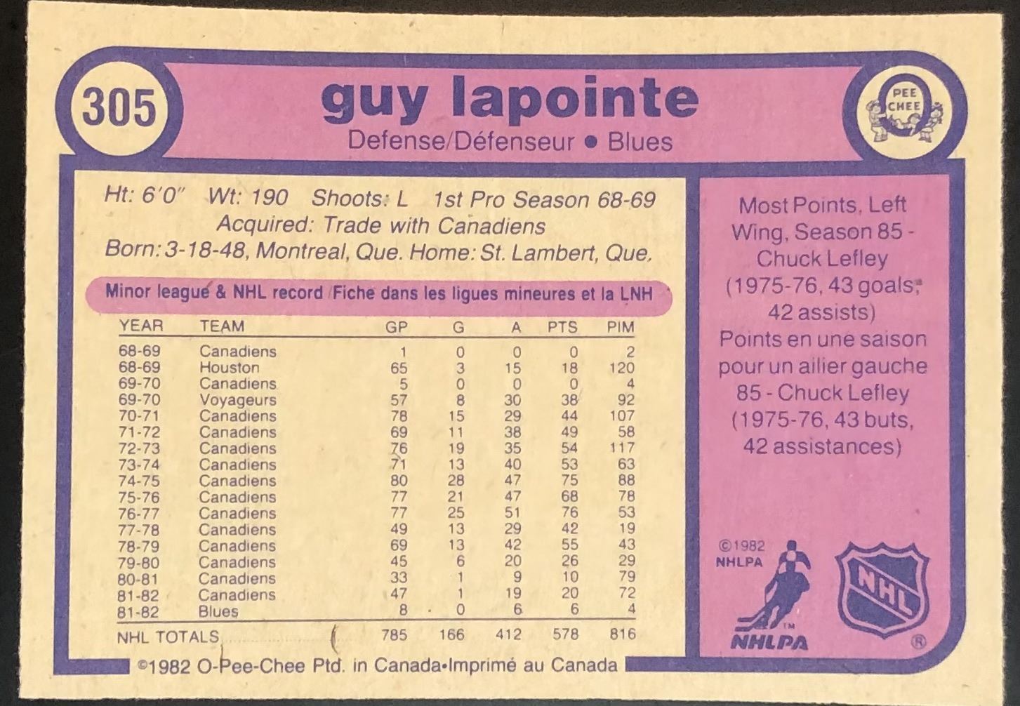 Lot 75 1982-83 O-PEE-CHEE GUY LAPOINTE (HOF)