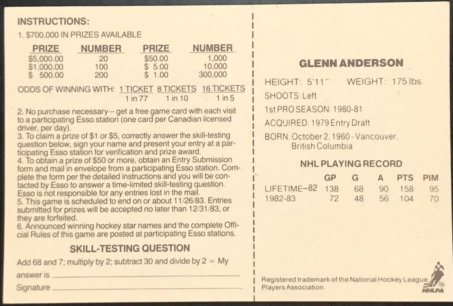 Lot 79 1983-84 NHL ESSO GLENN ANDERSON (HOF)