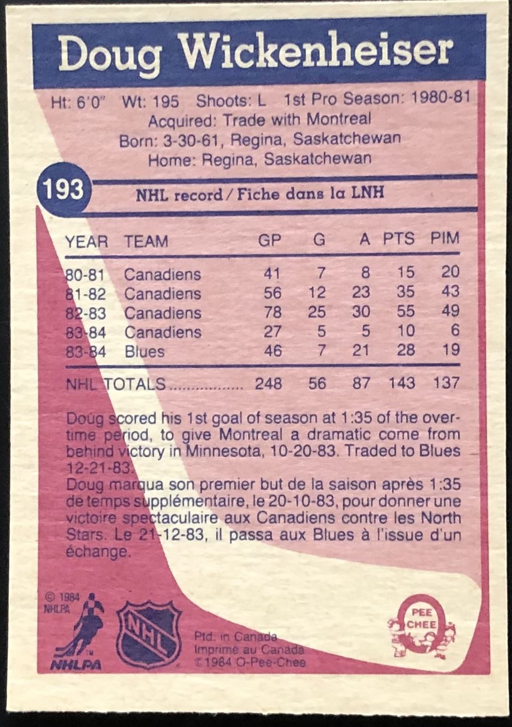 Lot 82 1984-85 O-PEE-CHEE DOUG WICKENHEISER