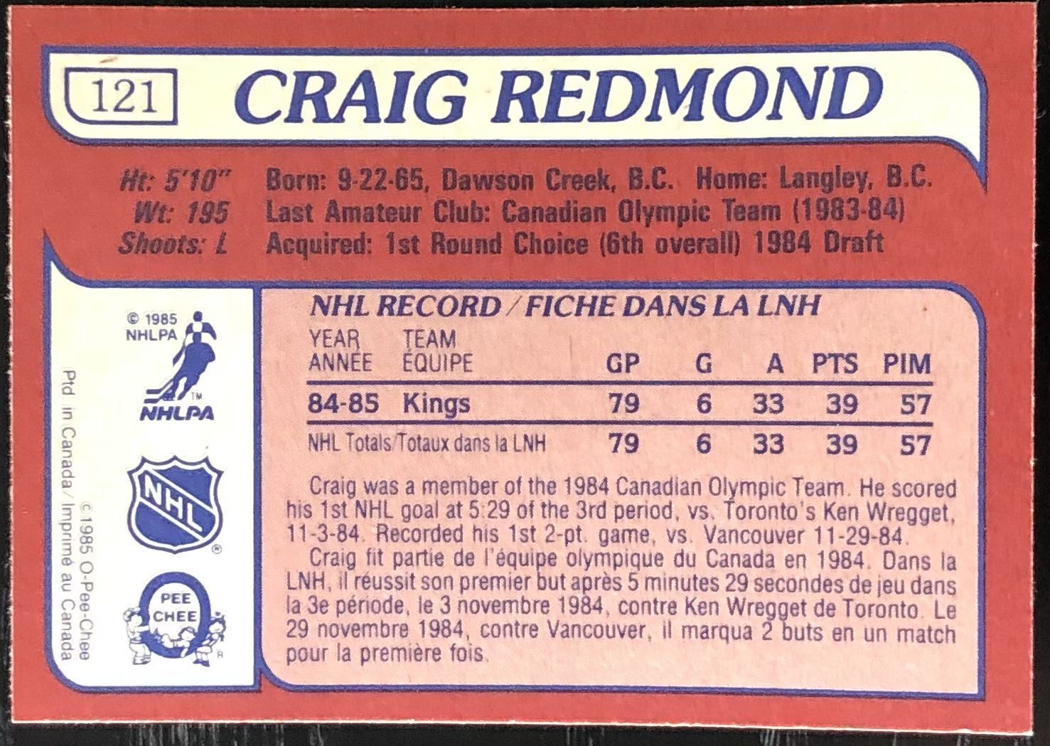 Lot 90 1985-86 O-PEE-CHEE CRAIG REDMOND ROOKIE CARD