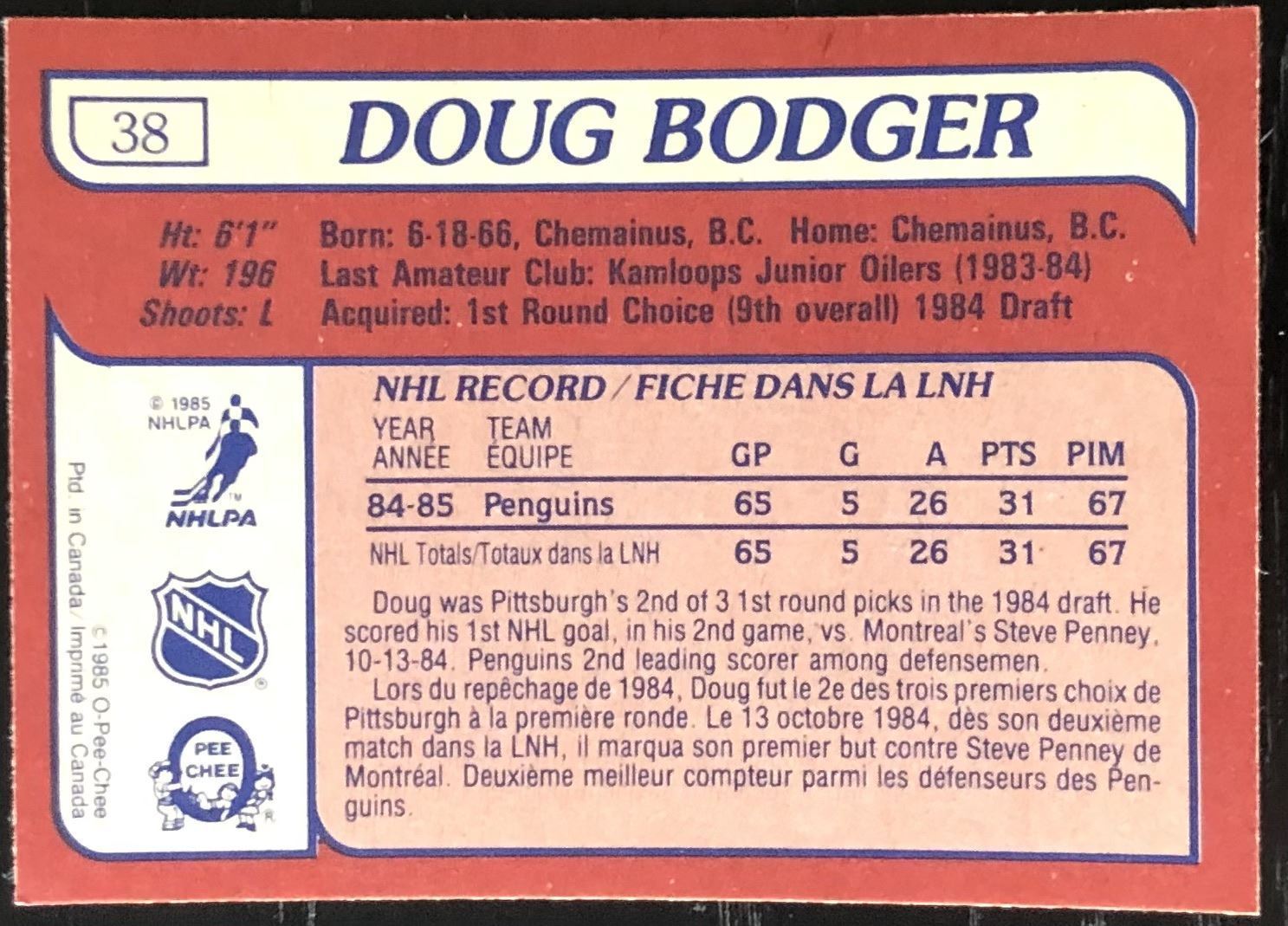 Lot 93 1985-86 O-PEE-CHEE DOUG BODGER ROOKIE CARD