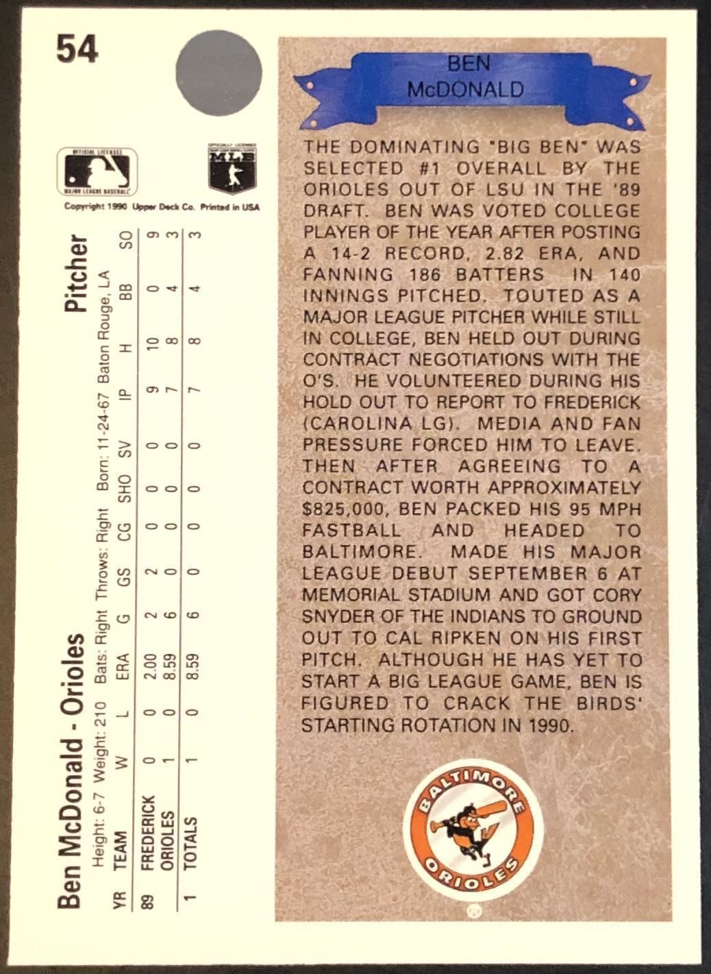 Lot 154 1990 UPPER DECK BEN McDONALD ROOKIE CARD