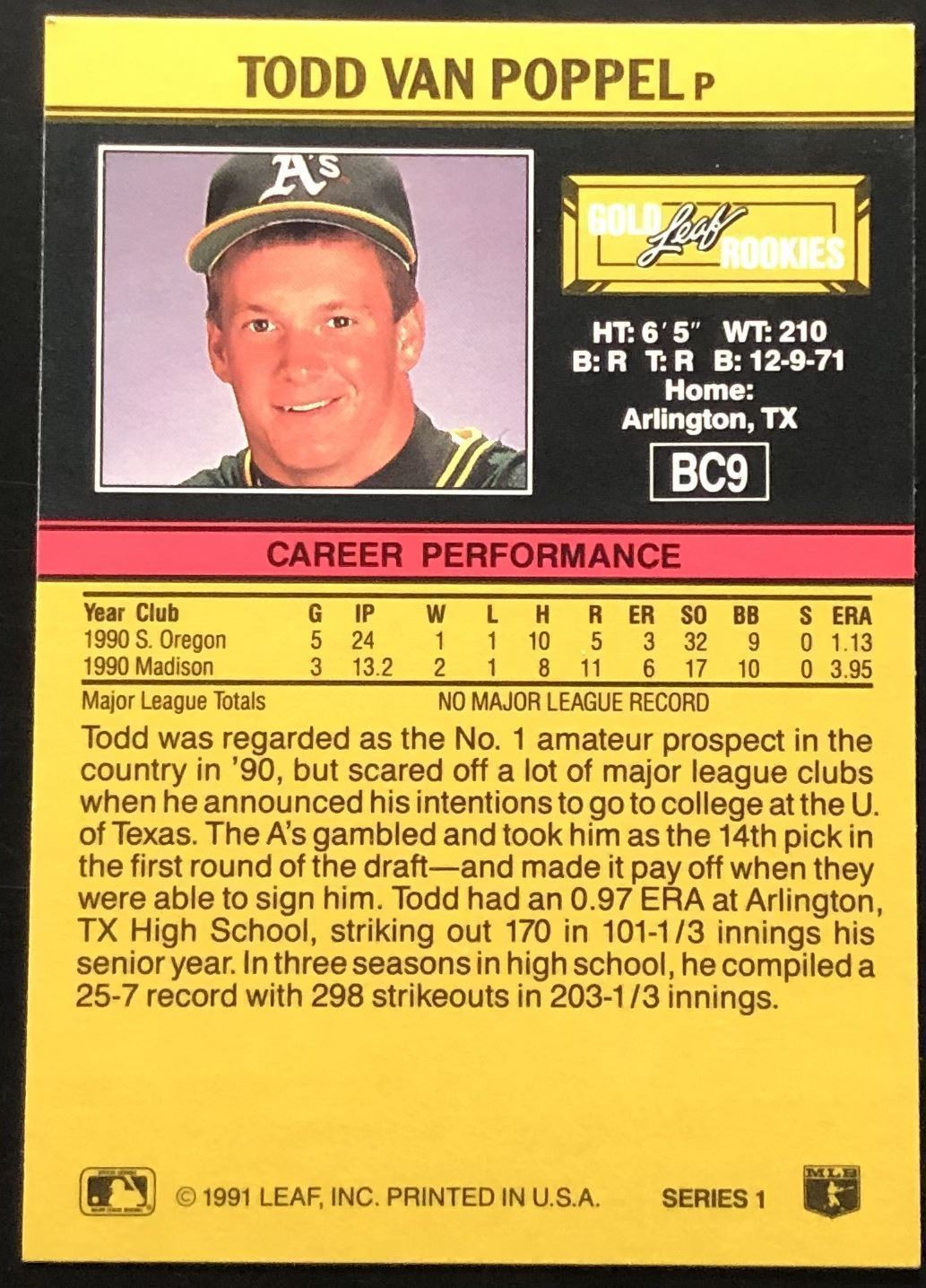 Lot 219 1991 LEAF TODD VAN POPPEL ROOKIE CARD