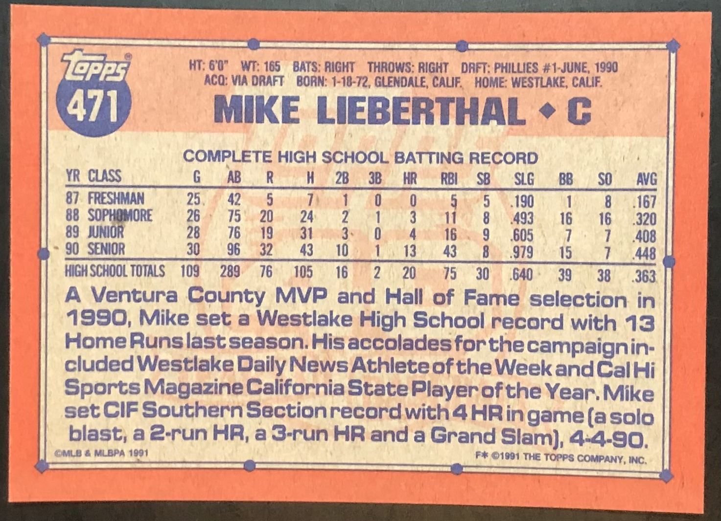 Lot 228 1991 TOPPS MIKE LIEBERTHAL ROOKIE CARD