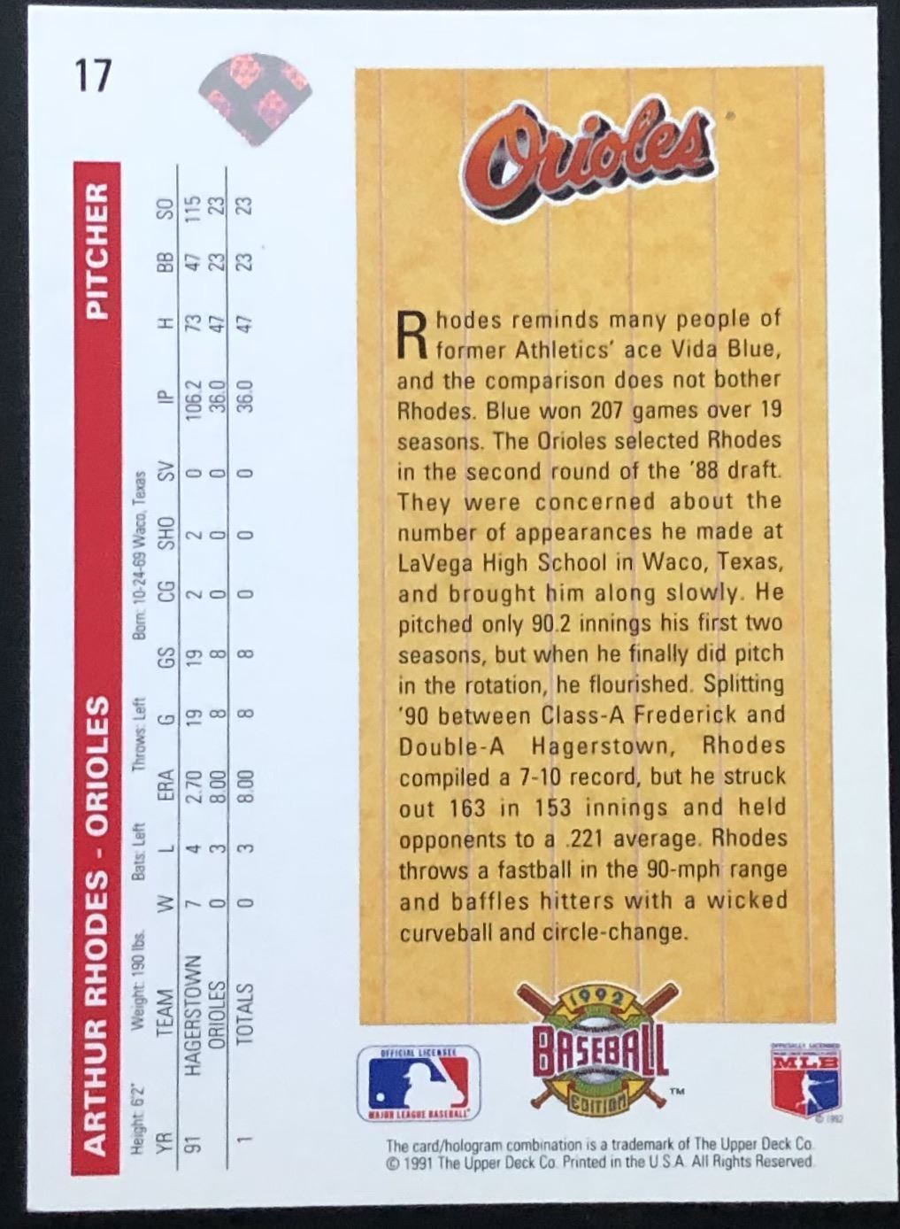 Lot 277 1993 UPPER DECK ARTHUR RHODES ROOKIE CARD