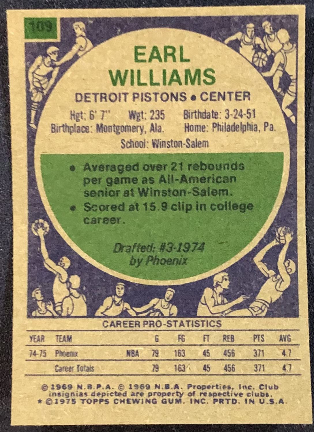 Lot 375 1975-76 TOPPS EARL WILLIAMS ROOKIE CARD