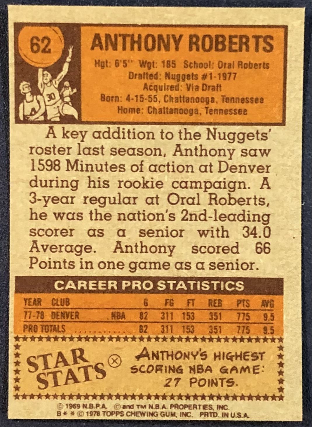 Lot 395 1978-79 TOPPS ANTHONY ROBERTS ROOKIE CARD