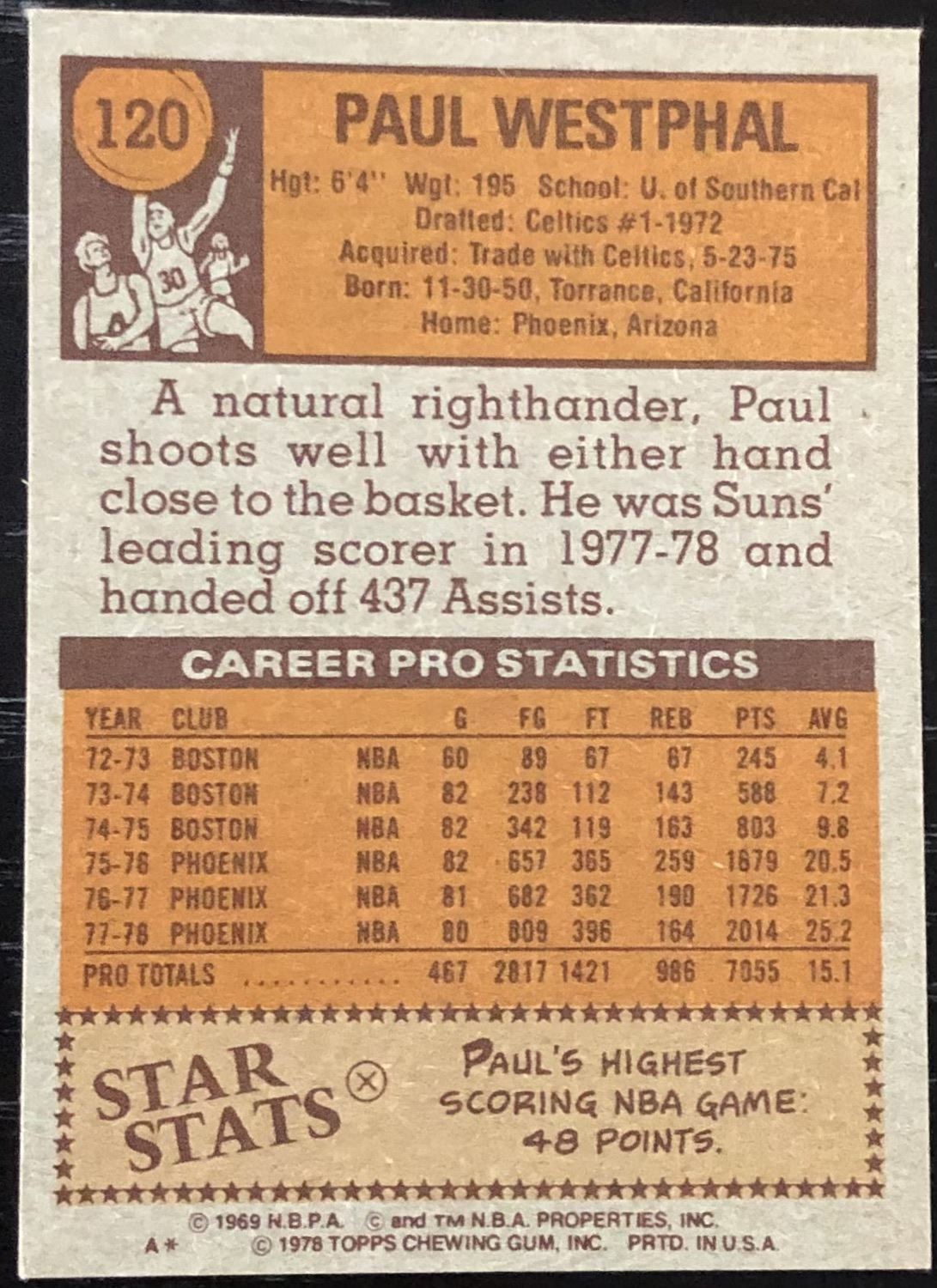 Lot 410 1978-79 TOPPS NBA PAUL WESTPHAL (HOF)