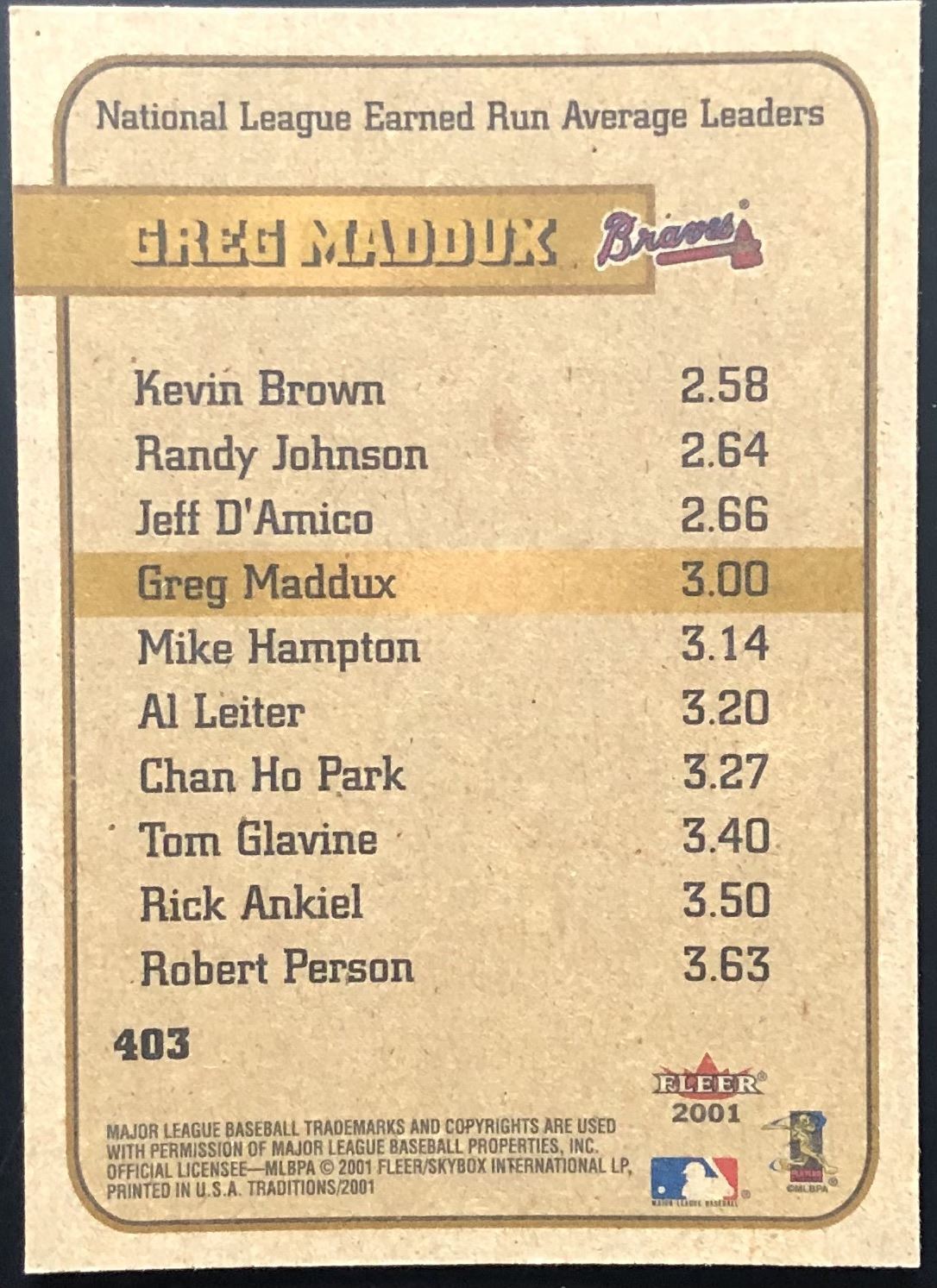 Lot 441 2001 FLEER TRADITION GREG MADDUX (HOF)