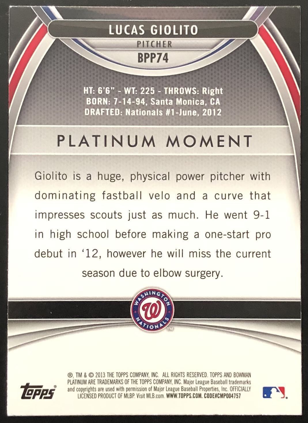 Lot 514 2013 BOWMAN PLATINUM LUCAS GIOLITO ROOKIE CARD