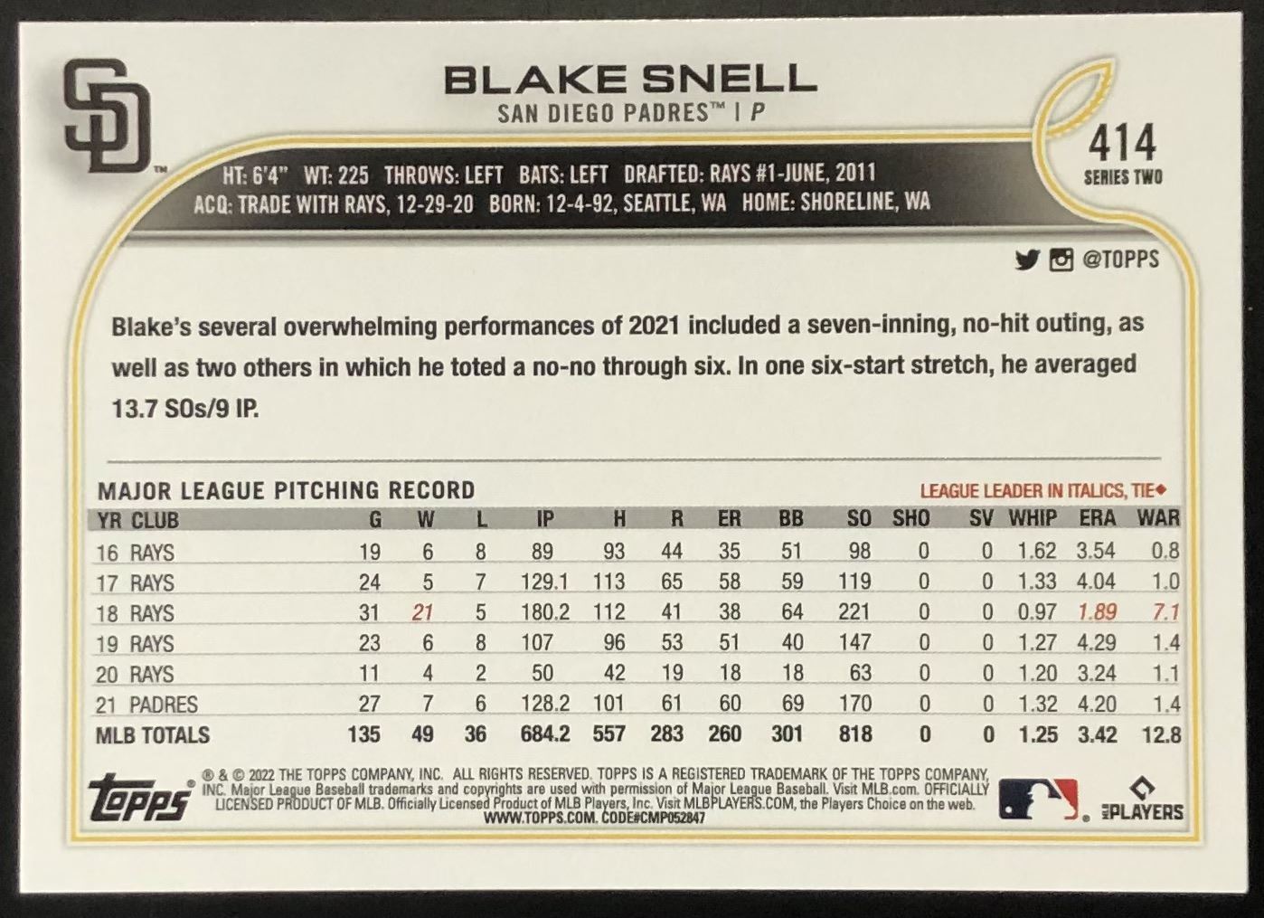 Lot 532 2022 TOPPS BLAKE SNELL