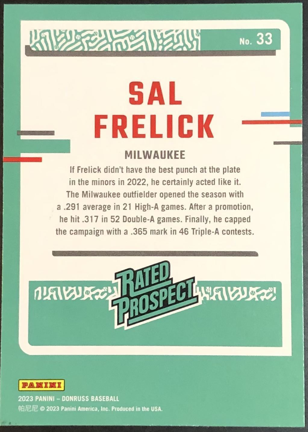 Lot 577 2023 DONRUSS SAL FRELICK ROOKIE CARD