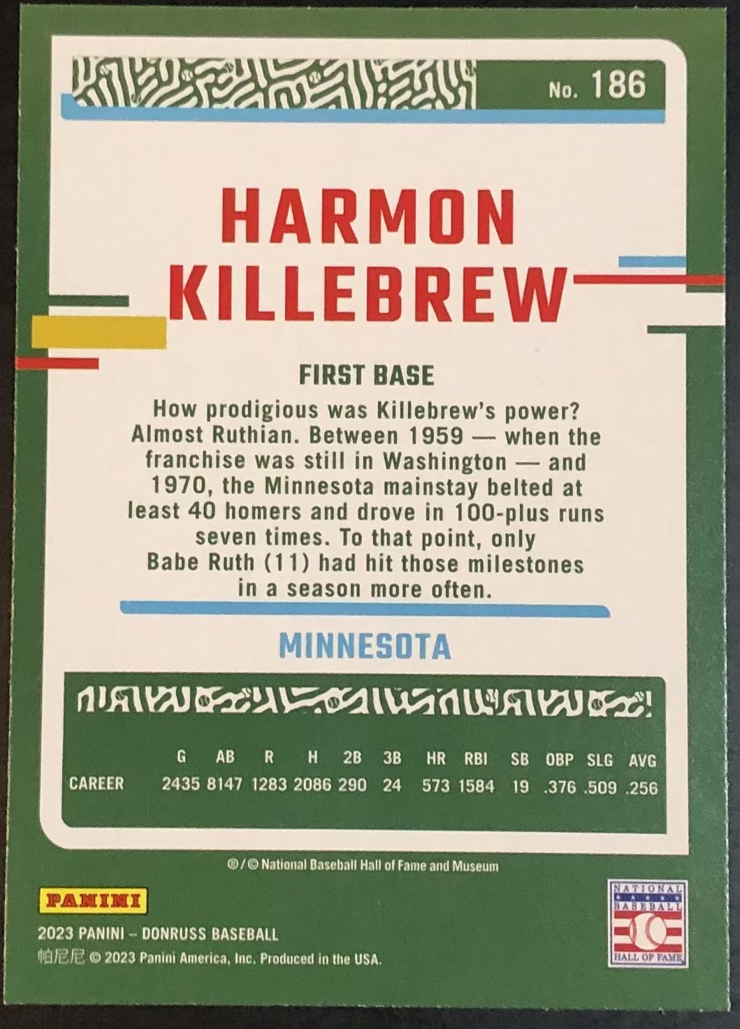 Lot 582 2023 DONRUSS YELLOW FLASH HARMON KILLEBREW (HOF)