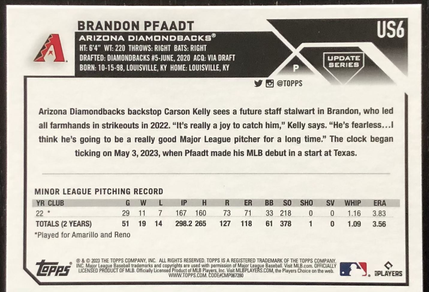 Lot 590 2023 TOPPS BRANDON PFAADT ROOKIE CARD