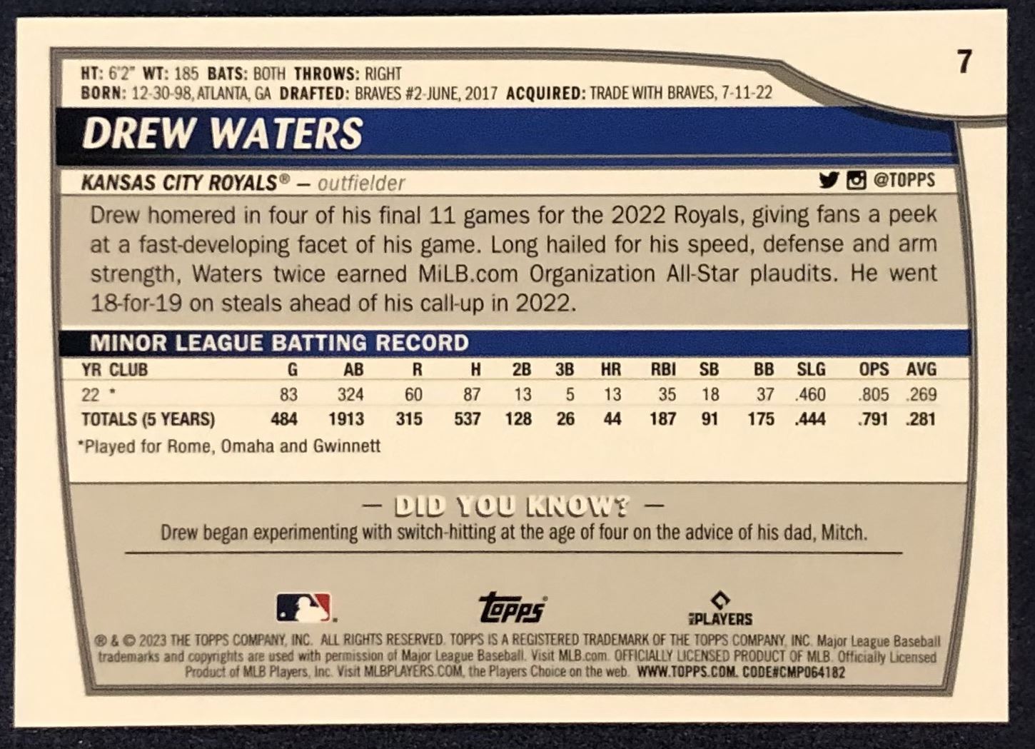 Lot 592 2023 TOPPS DREW WATERS ROOKIE CARD