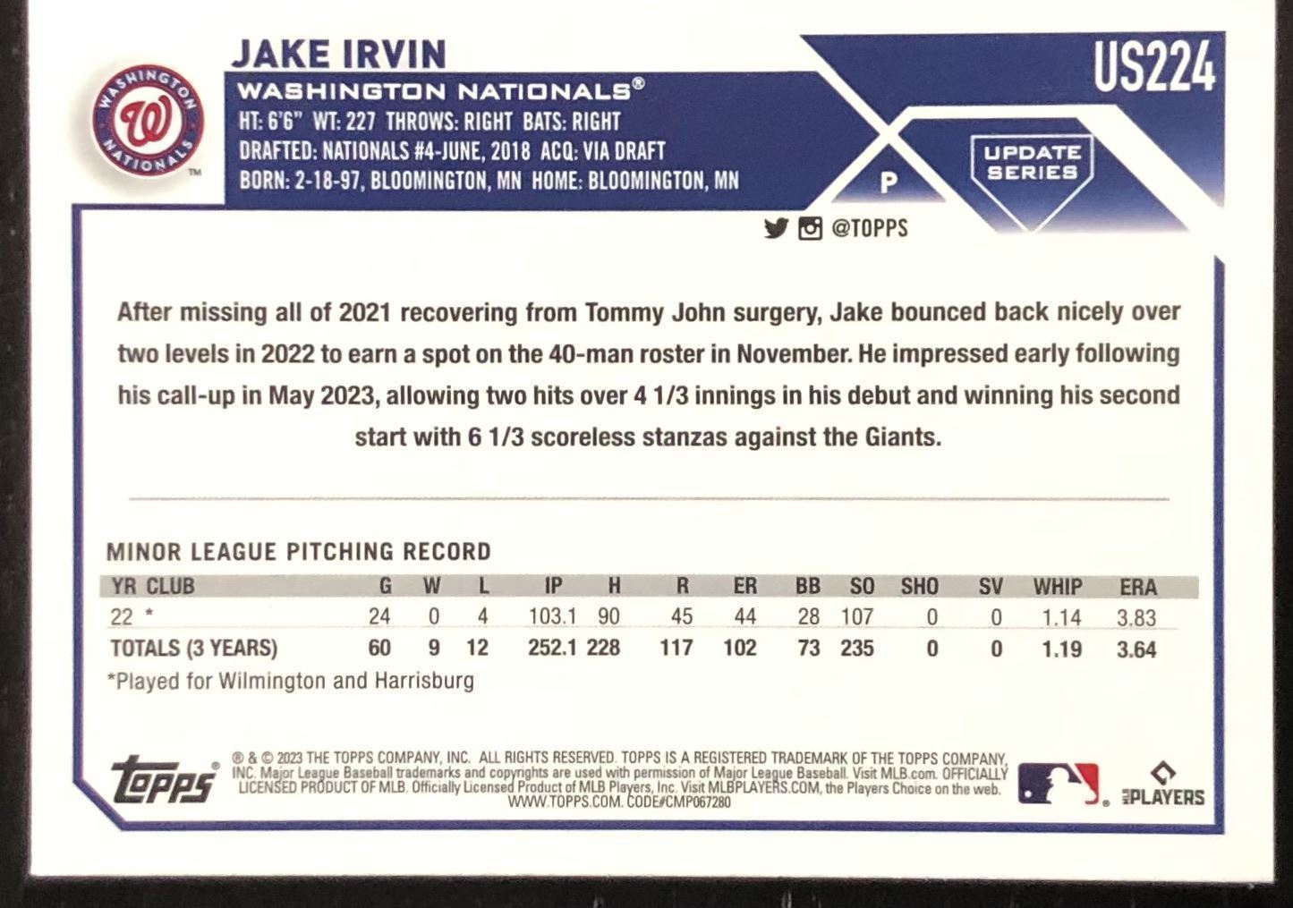 Lot 598 2023 TOPPS JAKE IRVIN ROOKIE CARD