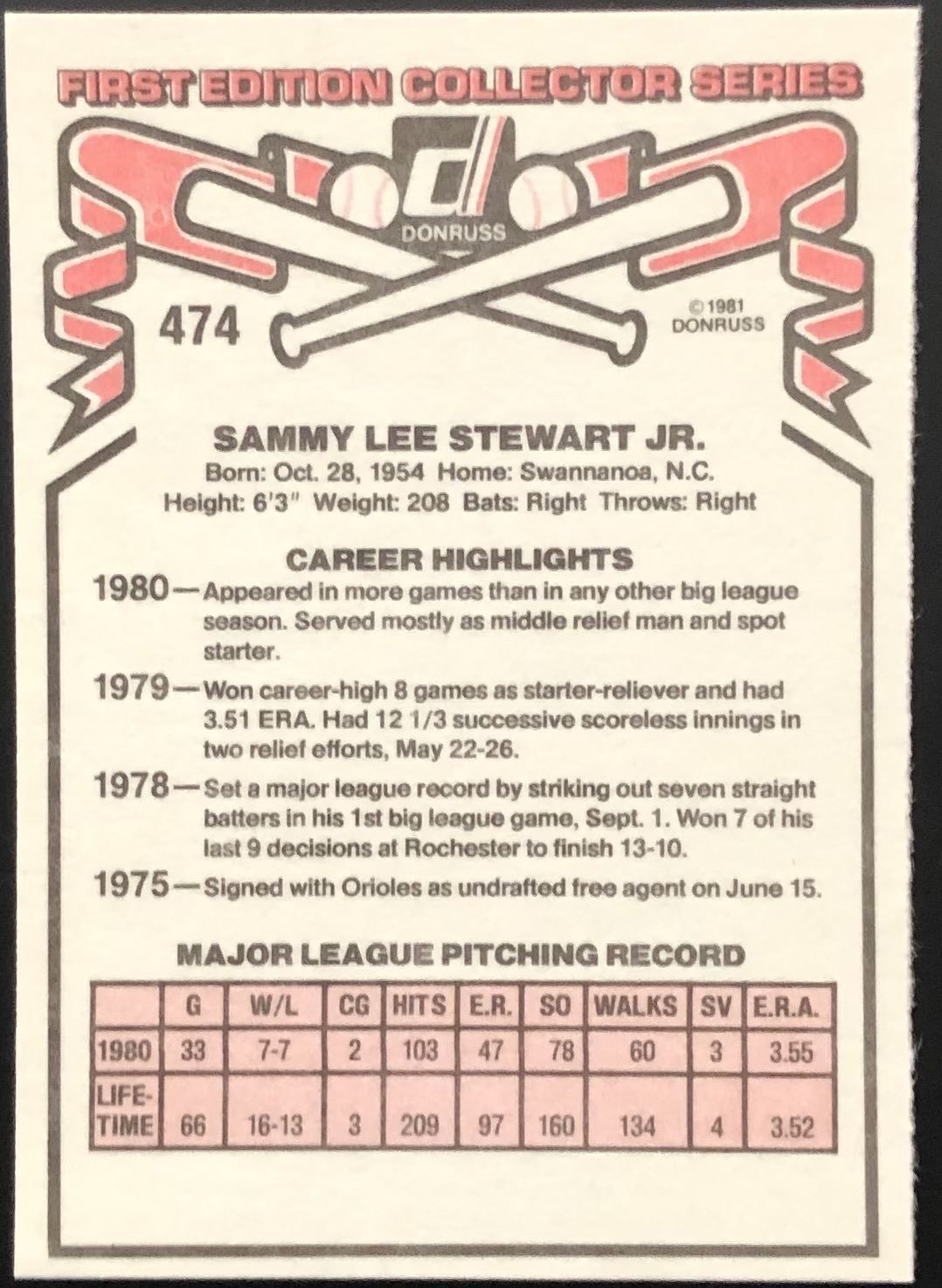 Lot 770 1981 DONRUSS SAMMY STEWART