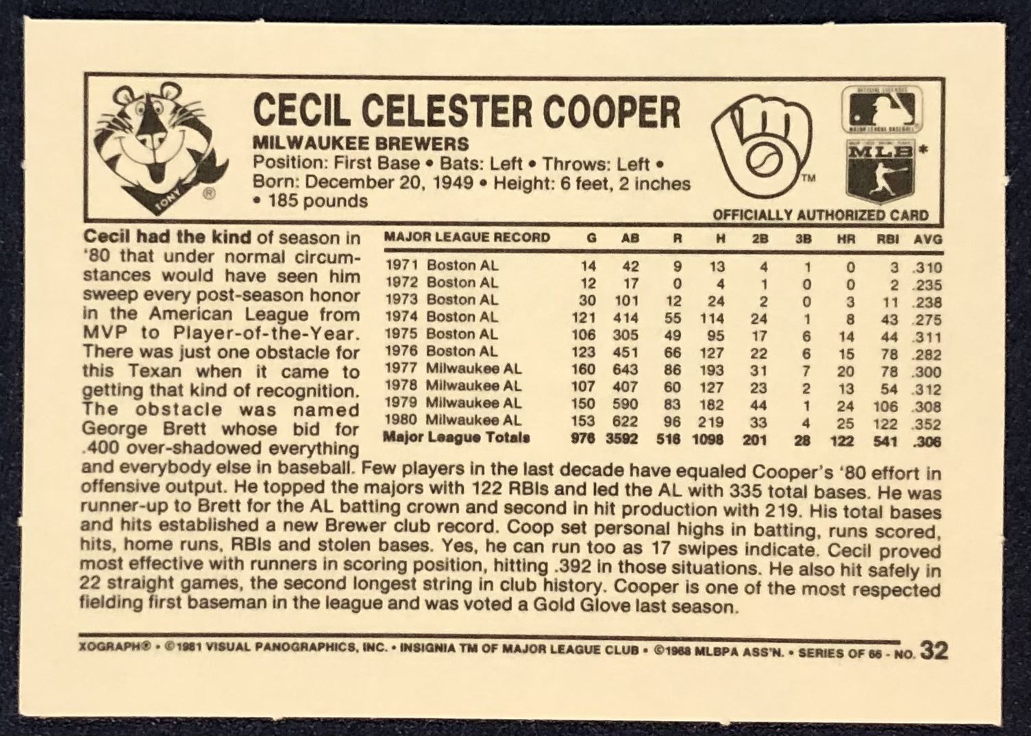Lot 774 1981 KELLOGGS 3-D BASEBALL CECIL COOPER