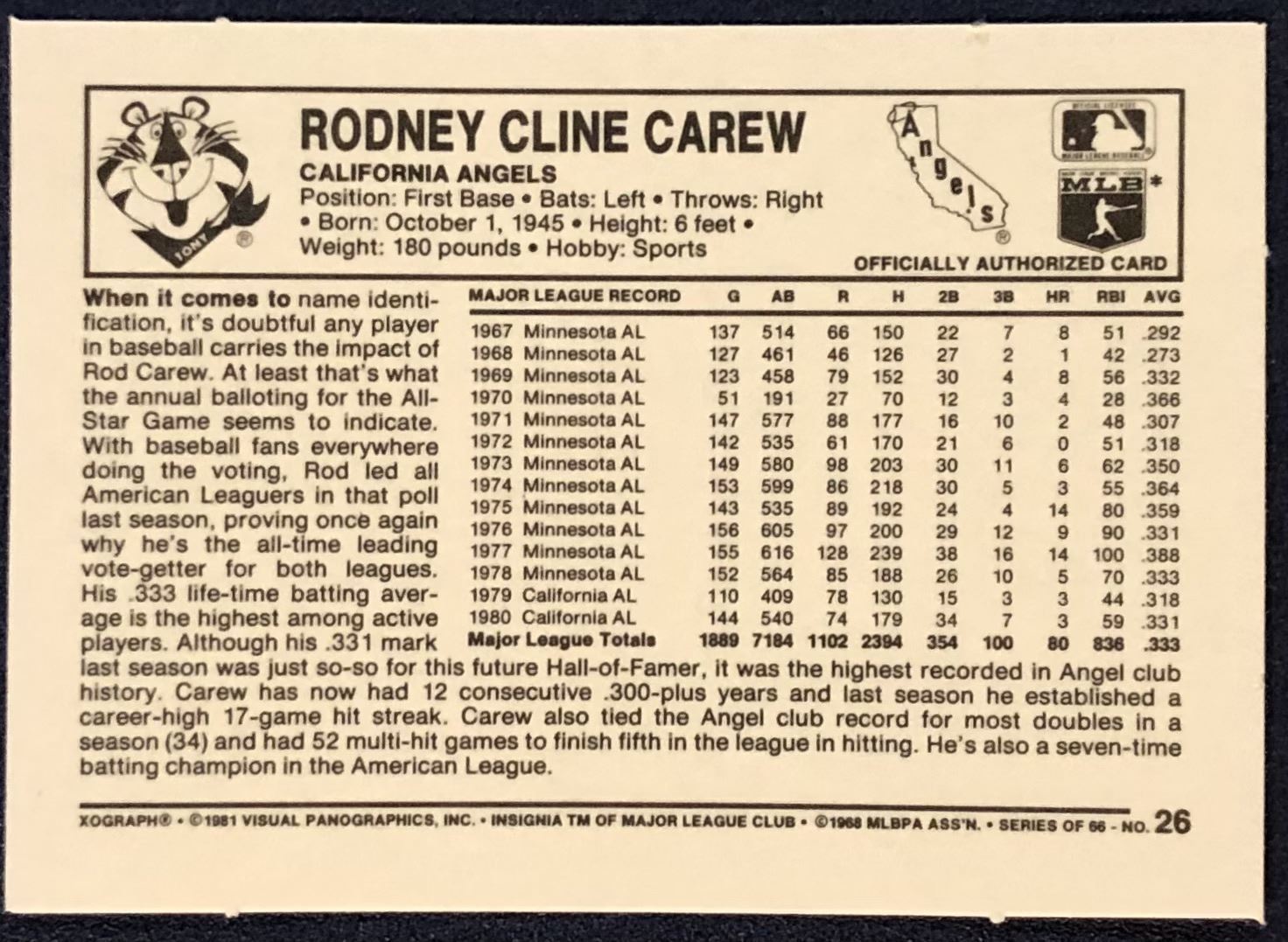 Lot 788 1981 KELLOGGS 3-D BASEBALL ROD CAREW (HOF)