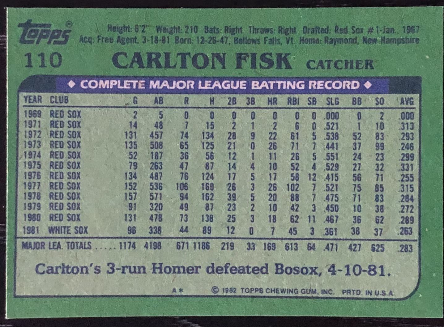 Lot 806 1982 TOPPS CARLTON FISK (HOF)