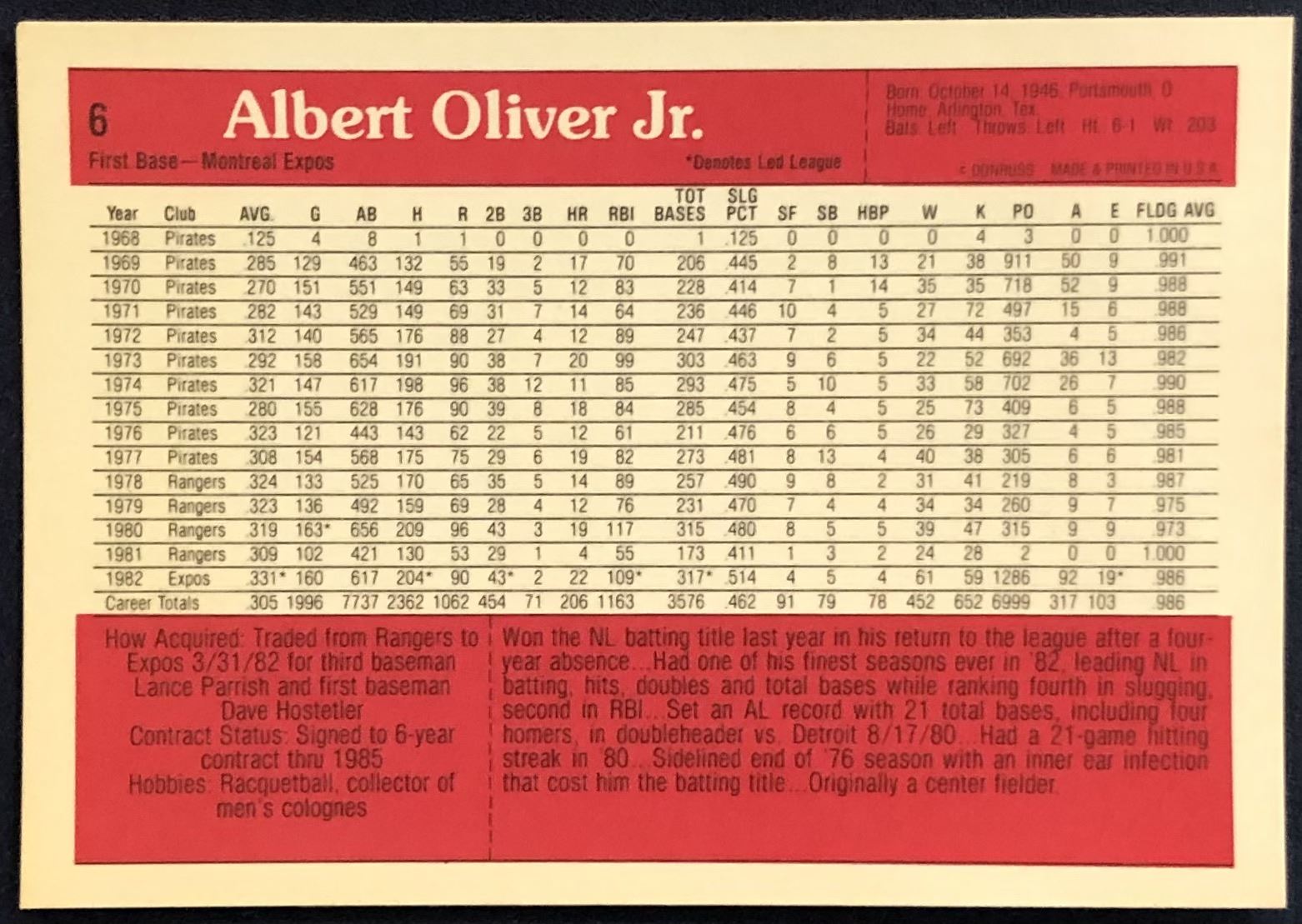 Lot 822 1983 DONRUSS ACTION ALL STARS - AL OLIVER