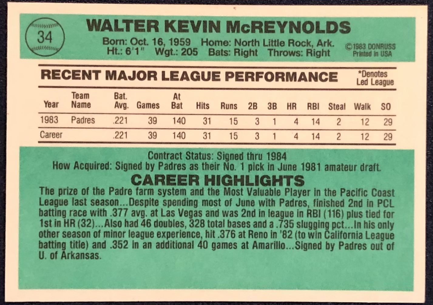 Lot 836 1984 DONRUSS KEVIN McREYNOLDS ROOKIE CARD