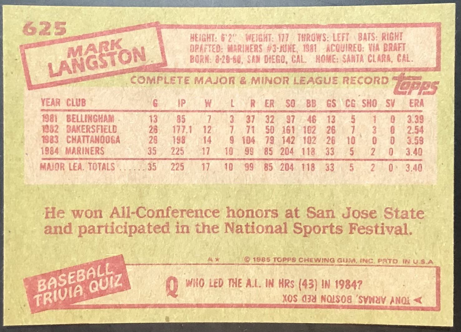 Lot 848 1985 TOPPS MARK LANGSTON ROOKIE CARD