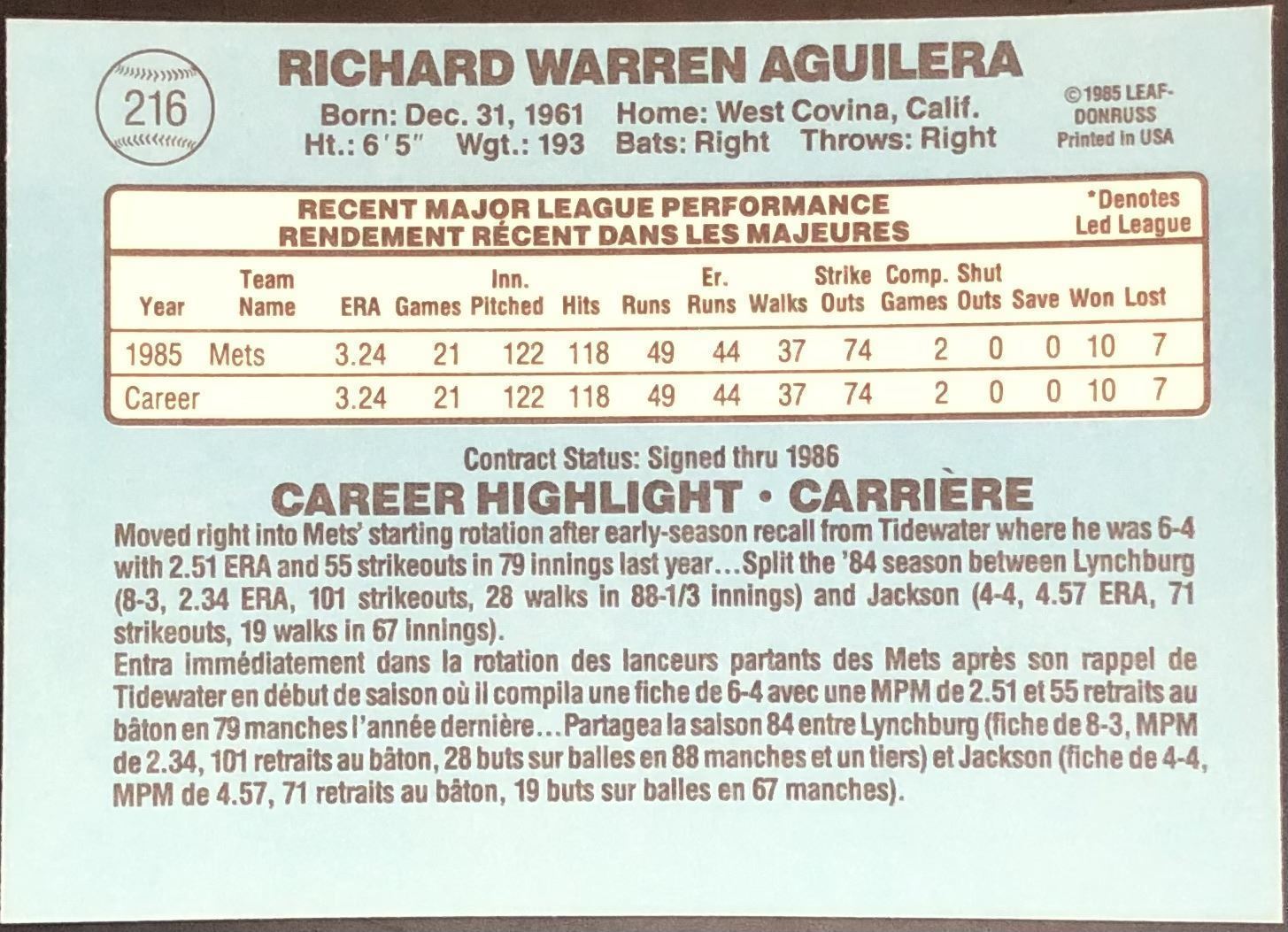 Lot 855 1986 LEAF RICK AGUILERA ROOKIE CARD