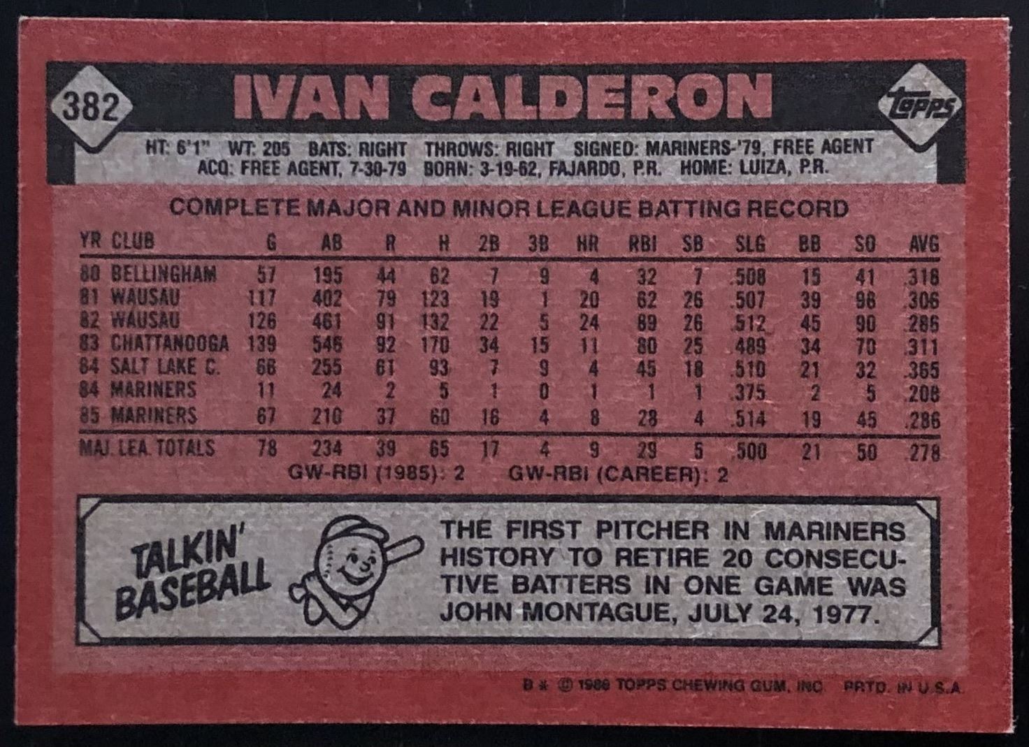 Lot 856 1986 TOPPS IVAN CALDERON ROOKIE CARD