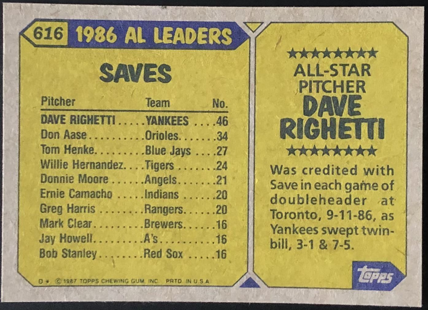 Lot 871 1987 TOPPS DAVE RIGHETTI (HOF)