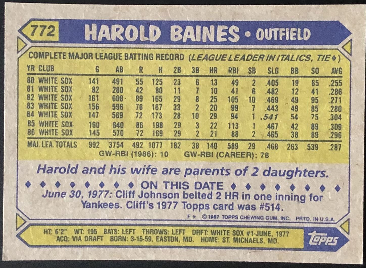 Lot 872 1987 TOPPS HAROLD BAINES (HOF)