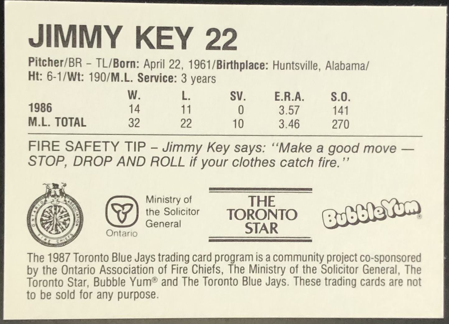Lot 877 1987 TORONTO BLUE JAYS FIRE DEPT - JIMMY KEY