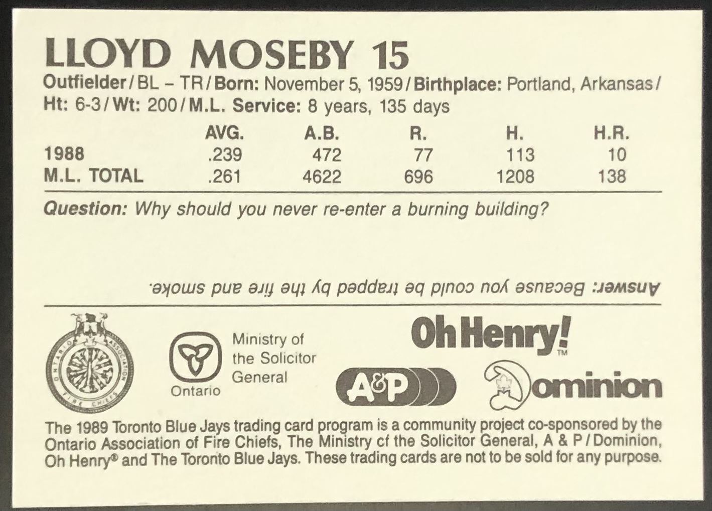 Lot 915 1989 TORONTO BLUE JAYS FIRE DEPT - LLOYD MOSEBY